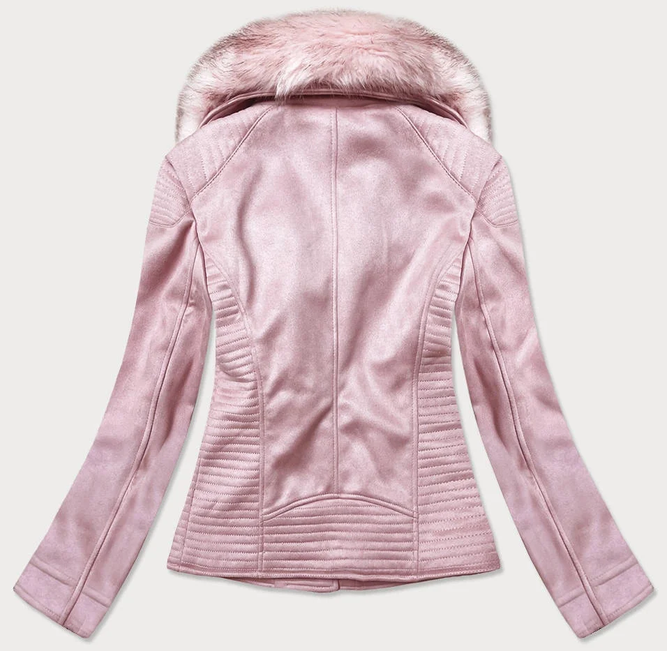 Dámská semišová bunda ramoneska v pudrově růžové barvě s kožešinou (6501big)
