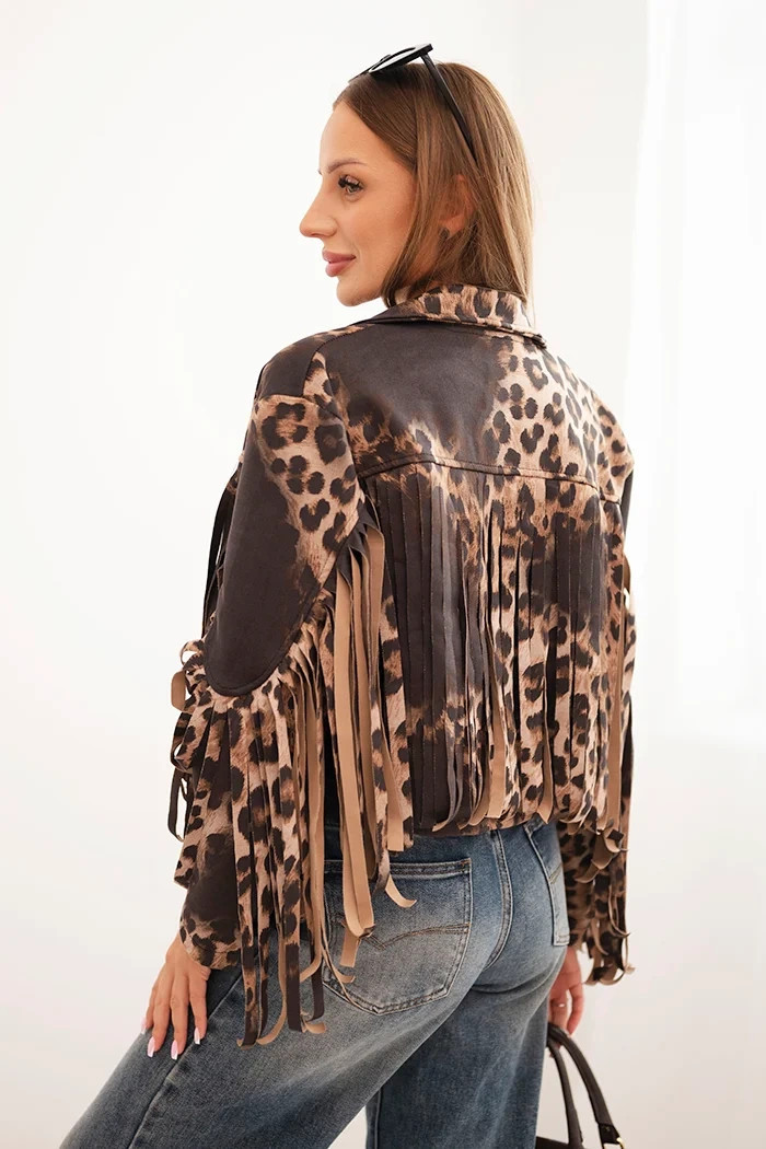 Dámská semišová bunda s leopardím vzorem a třásněmi černá