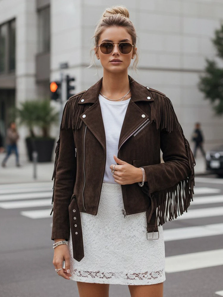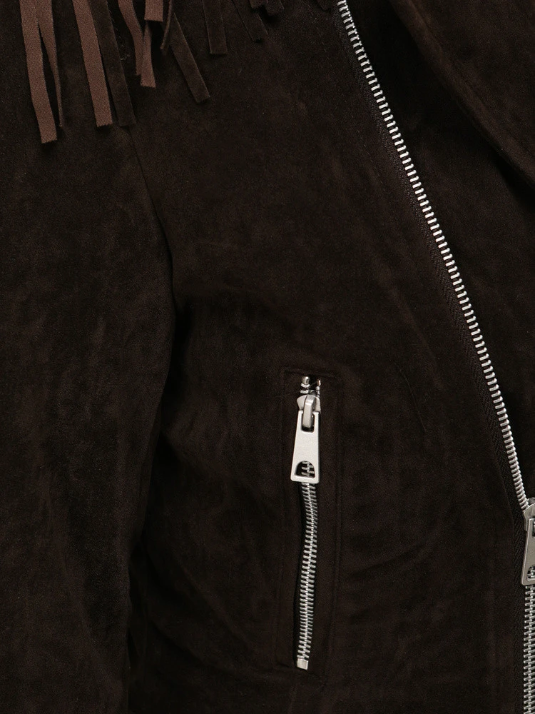 Tato bunda s krátkou délkou a motorkářským charakterem se osvědčí jako výrazný stylový prvek. Je vyrobena z imitace semiše a vyniká ozdobnými střapci na rukávech a zádech. Asymetrické zapínání na zip jí dodává dynamickou formu a podtrhuje moderní styl. Kapsy zvyšují funkčnost pro každodenní použití.