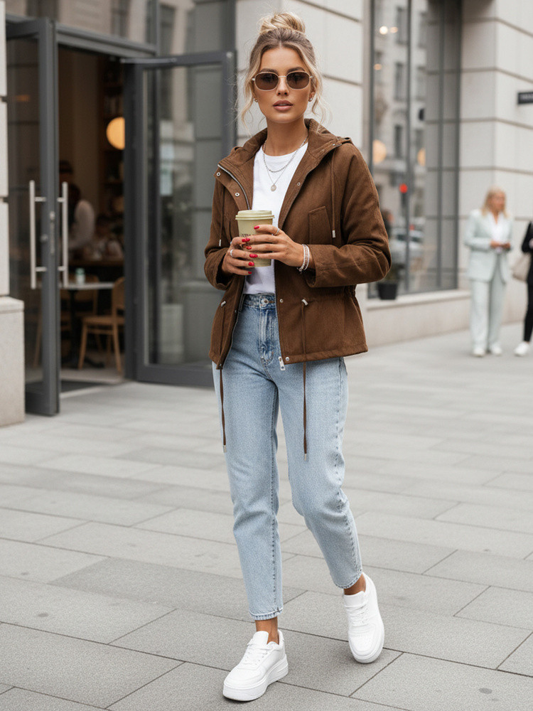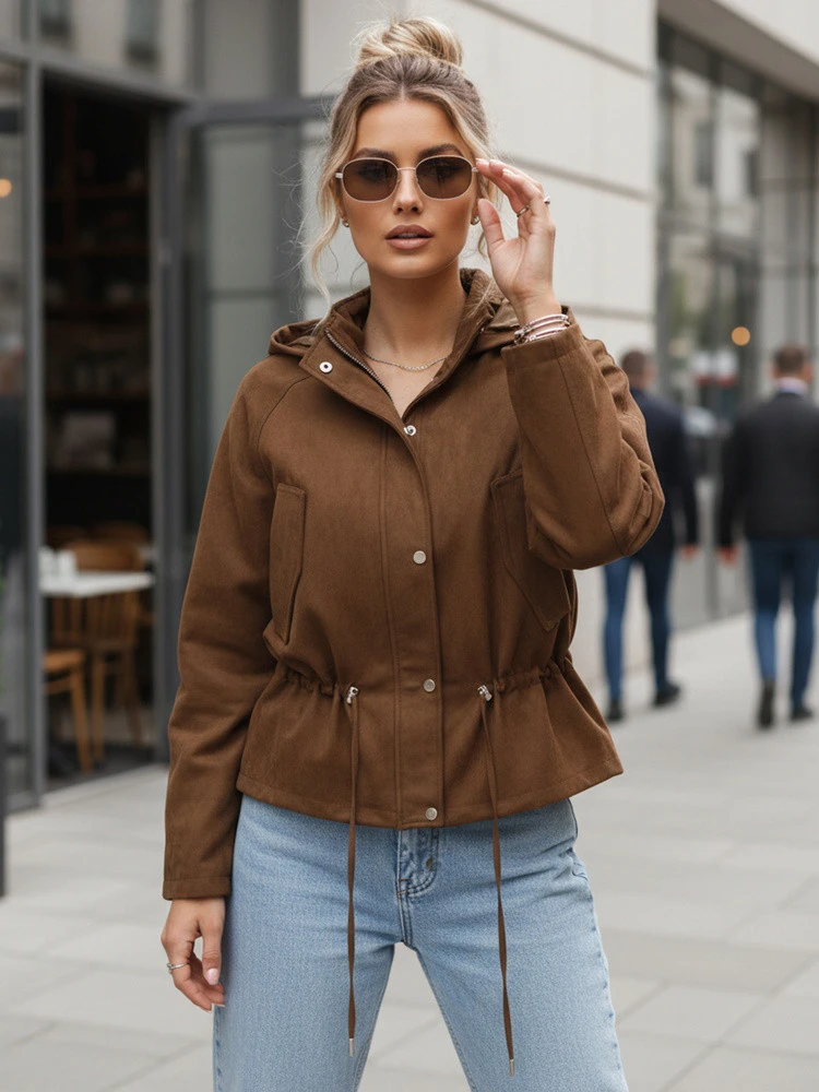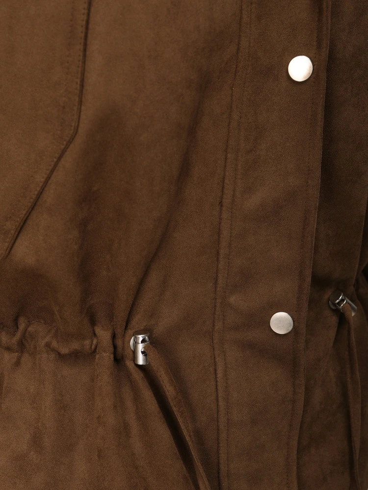 Tato semišová bunda s krátkou délkou, která je nezbytným doplňkem této sezóny, usnadňuje budování každodenního vzhledu a dobře sedí na postavě. Kapuce vás ochrání před větrem a regulace v pase vám umožní přizpůsobit střih podle vašich preferencí. Zapínání na zip a patentky stabilizuje přední část a pomáhá udržet teplo a bunda je vyrobena z materiálu imitujícího semiš.