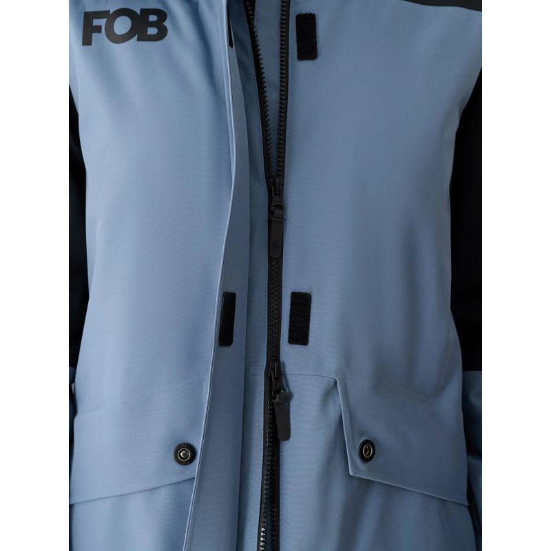 Damska kurtka snowboardowa z membraną jest wyposażona w zintegrowany kaptur z profilowanym daszkiem oraz regulacją objętości i głębokości. Szyję osłania wysoki kołnierz ocieplony miękkim trykotem, który dodatkowo zabezpieczy przed chłodem i wiatrem. Rękawy zakończone są mankietami z regulacją na rzep. Przedłużone wewnętrzne elastyczne mankiety z otworami na kciuki osłonią nadgarstki i dłonie przed zimnym wiatrem. Pod pachami umieszczono wentylację zapinaną na jednokierunkowy zamek kryty pod plisą, który daje możliwość regulacji przepływu powietrza. Po bokach znajdują się 2 kieszenie zapinane na zamek. Natomiast w środku znajduje się otwarta kieszeń na gogle, która wykonana jest z elastycznej siateczki. Co więcej, wewnętrzna kieszeń z zamkiem pozwoli na bezpieczny transport cennych przedmiotów, np. telefonu. Na lewym ramieniu jest niewielka kieszonka z zapięciem na rzep oraz kieszonka ski pass z zapięciem na zamek, która pomieści karnet narciarski lub inne drobiazg