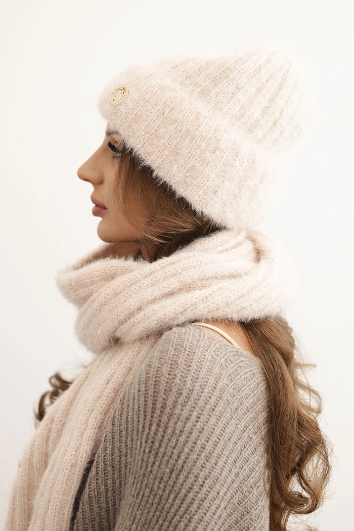 Stylový zimní komplet složený z měkké, nadýchané čepice a ribbed šály. Čepice se dokonale přizpůsobí hlavě, zajišťuje tepelný komfort a módní vzhled. Šála klasické délky se pohodlně omotává kolem krku a zaručuje ochranu před chladem.
