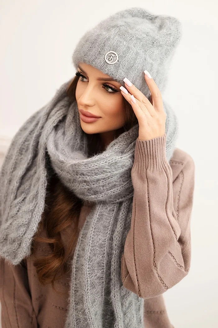 Čepice má klasický střih s módním ohrnutím a zlatou ozdobou vpředu, která dodává celku eleganci. Šála je dlouhá a široká – lze ji volně omotat kolem krku, což zajišťuje dodatečnou ochranu před zimou.