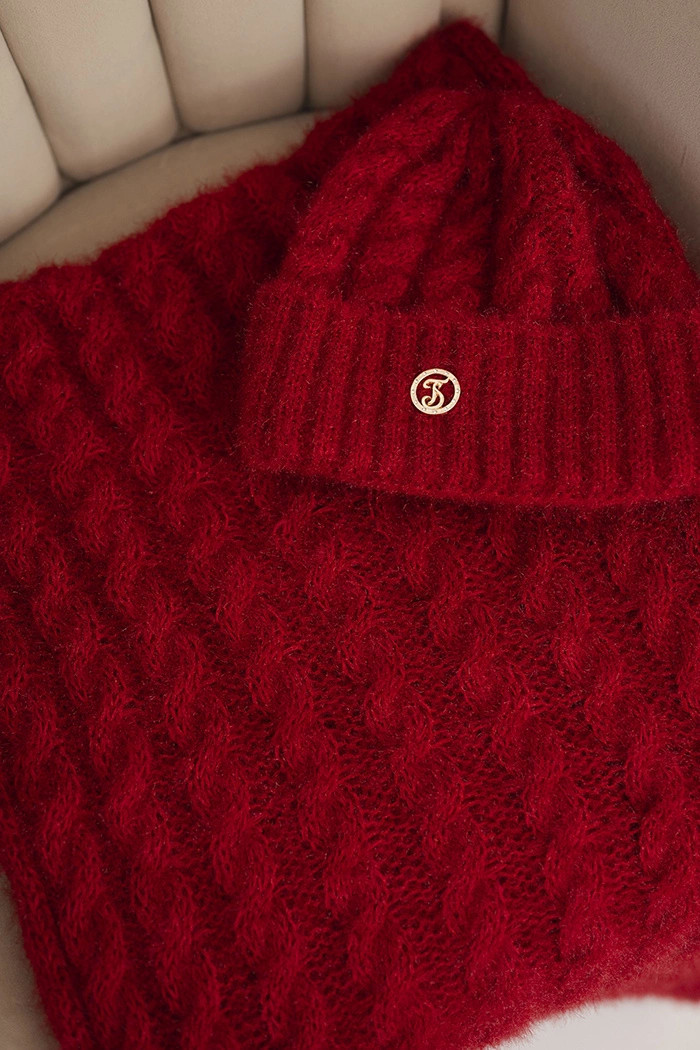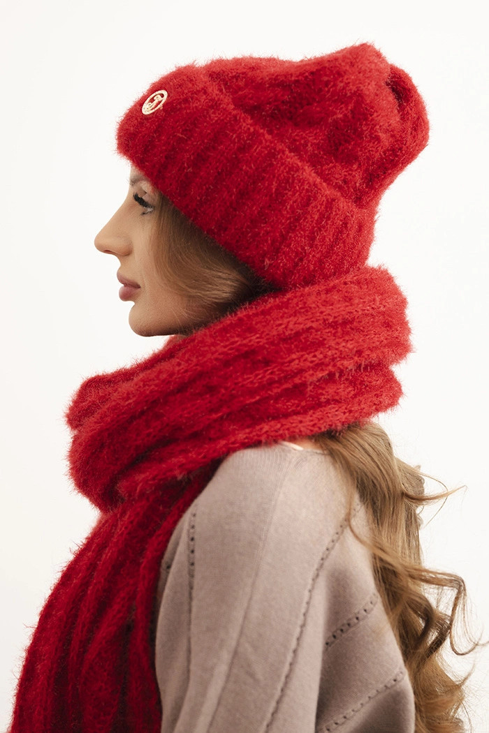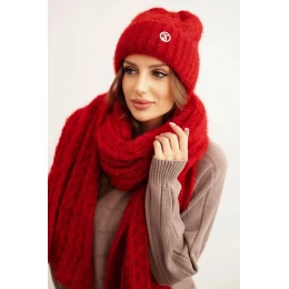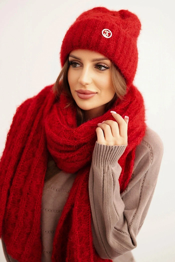 Přidání recenze k Dámská souprava čepice a šálu s proužkem a ozdobou červená