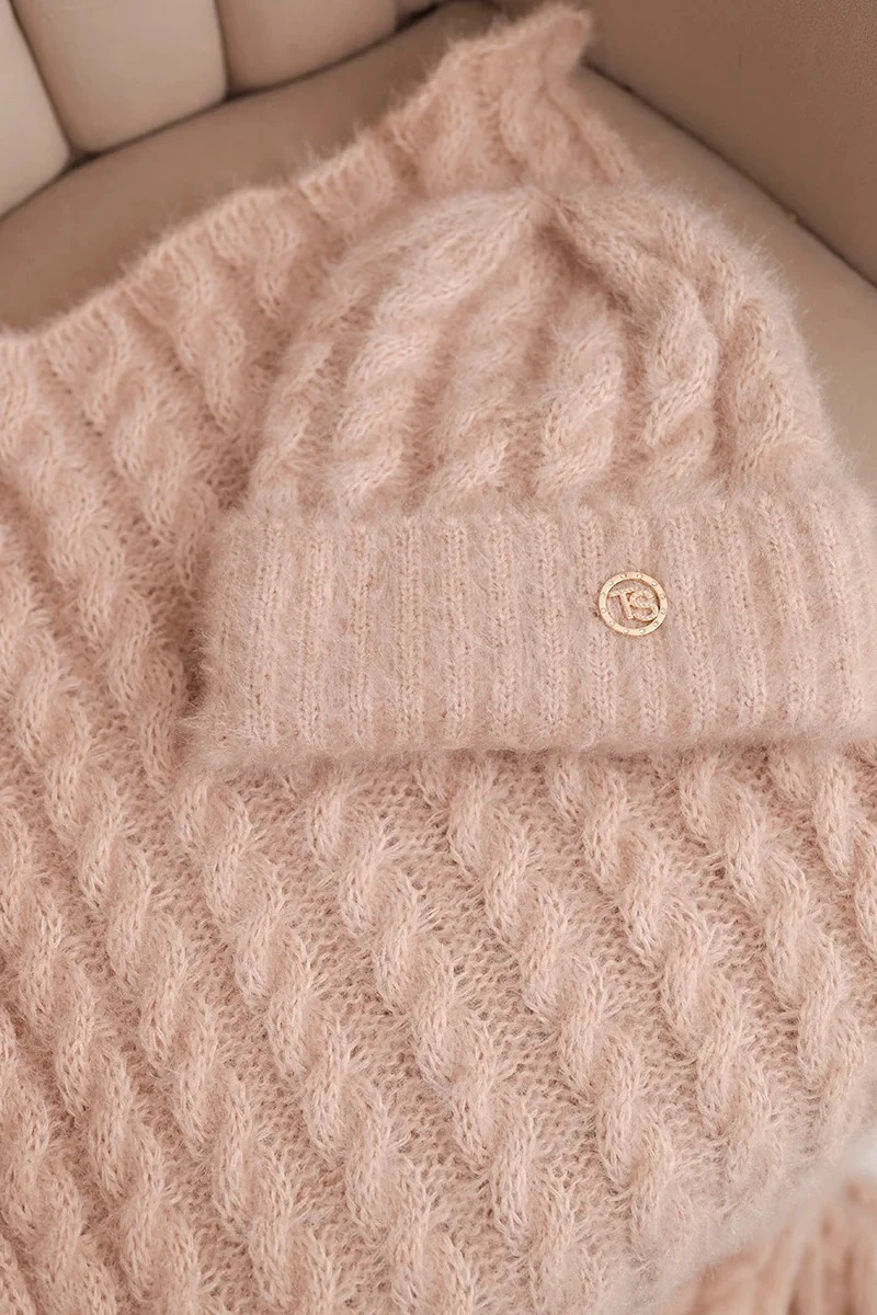 Čepice má klasický střih s módním ohrnutím a zlatou ozdobou vpředu, která dodává celku eleganci. Šála je dlouhá a široká – lze ji volně omotat kolem krku, což zajišťuje dodatečnou ochranu před zimou.