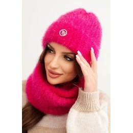 Dámská souprava čepice a šály zimní nadýchaná s ozdobným emblémem fuchsie