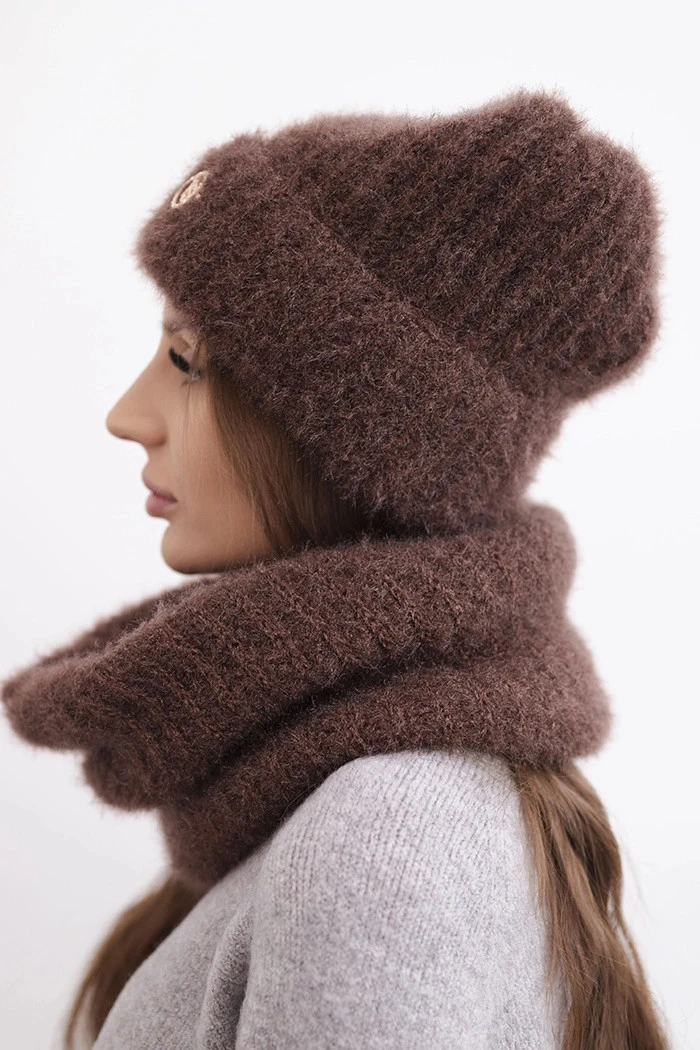 Sada skládající se z čepice a nákrčníku, vyrobená z nadýchané a měkké pleteniny s příjemnou strukturou. Materiál je elastický a dobře se přizpůsobuje hlavě a krku, poskytující komfort a teplo v chladných dnech.