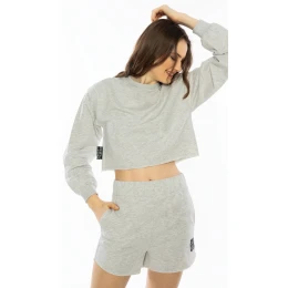Dámská souprava Daniela. Dámská souprava se skládá z trička mikinového typu a šortkových kalhot. Kratší jednobarevný mikinový top má dlouhé rukávy zakončené panty a na straně malý černý štítek s nápisem Lounge. Krátké moderní šortky s vyvýšeným pasem mají praktické kapsy. Použitý materiál je jemný a poddajný na dotek. Pyžamo je vhodné i na denní nošení.