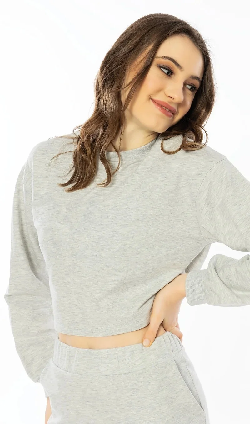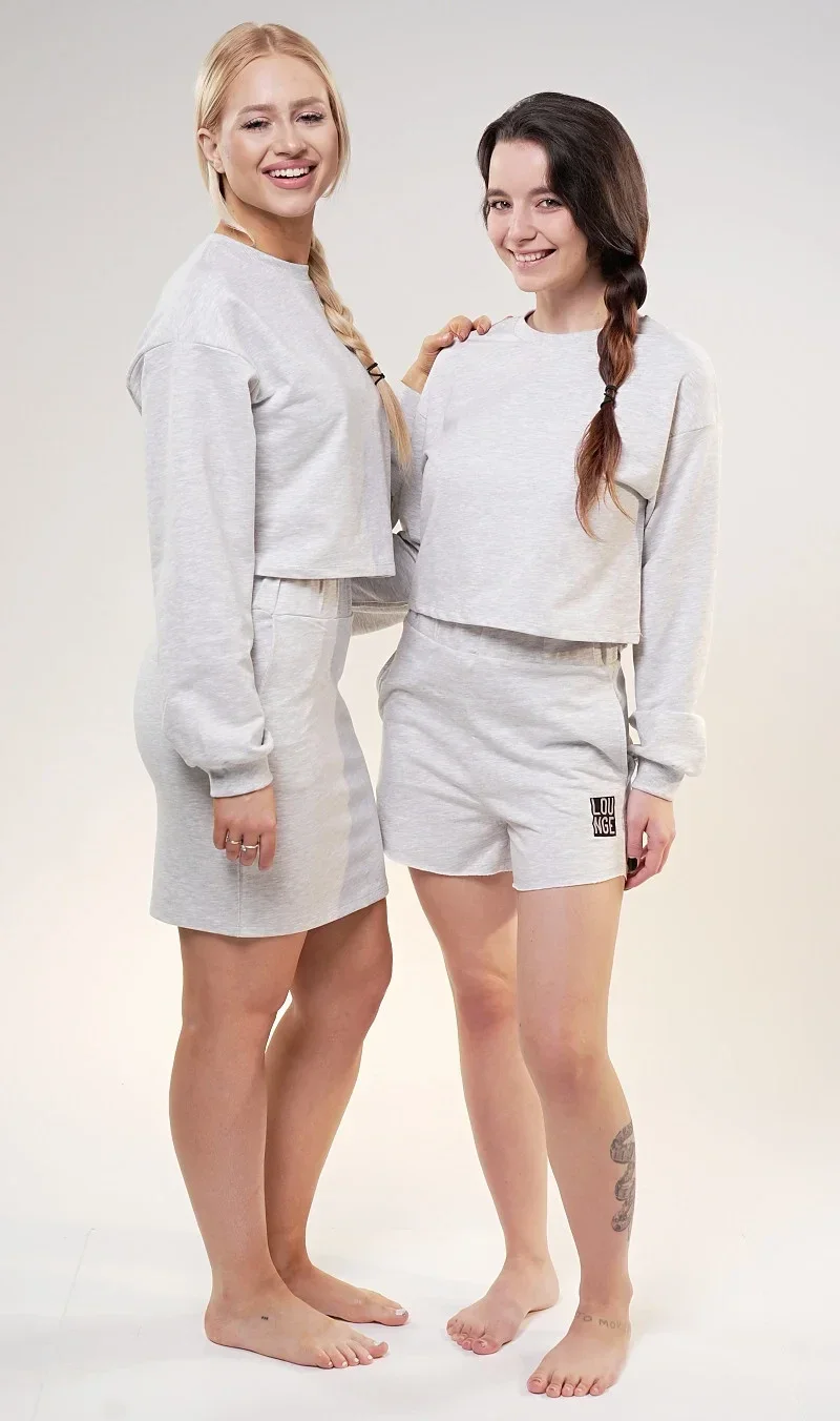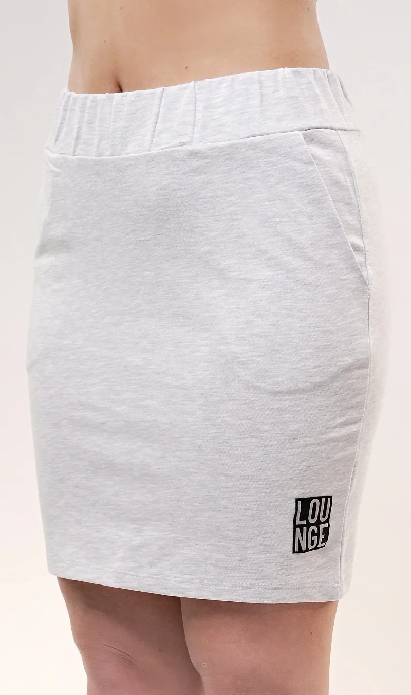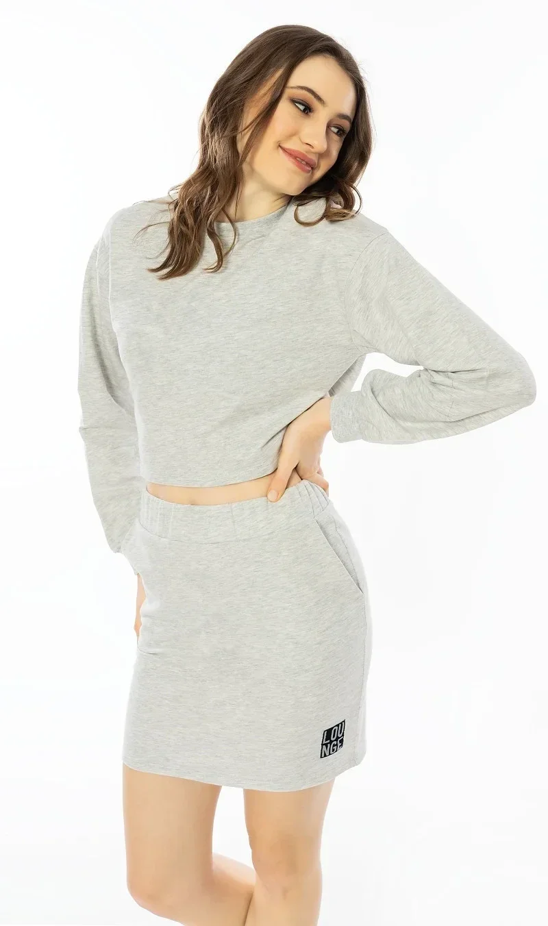 Dámská souprava Denisa. Dámská souprava se skládá z trička s dlouhým rukávem a sukně. Mikina má kulatý výstřih, rukávy zakončené panty a moderní zkrácenou délku. Sukně má praktické kapsy a gumu v pase. Komplet je jednobarevný, na sukni je černá nášivka Lounge. Použitý materiál s vysokým obsahem bavlny je příjemný a poddajný na dotek. Souprava je pohodlná a využijete ji téměř při všech volnočasových aktivitách.