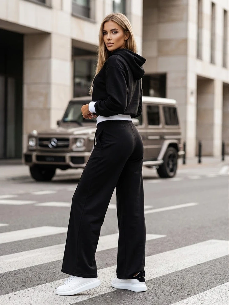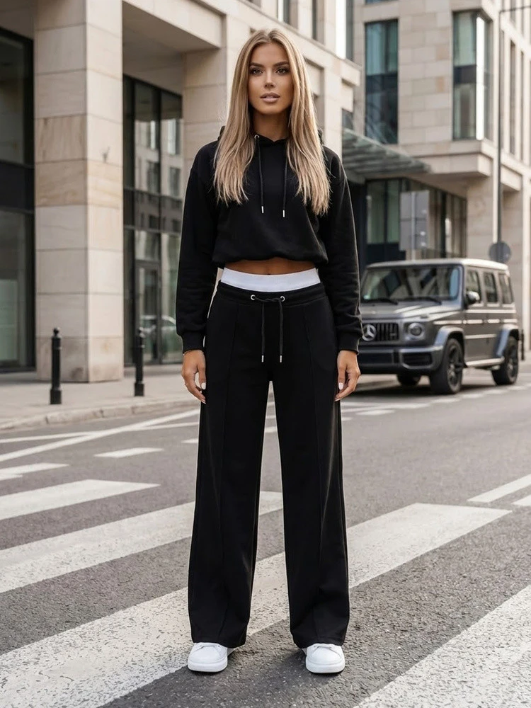 Tato dámská tepláková souprava s moderním městským charakterem kombinuje pohodlí s výraznou formou. Souprava se skládá z krátké mikiny s kapucí a širokých kalhot, které poskytují volnost pohybu. Bavlněný materiál s přídavkem elastanu se dobře přizpůsobí siluetě a zůstává pohodlný po celý den. Celá souprava vytváří konzistentní základ pro každodenní streetwearový styl.