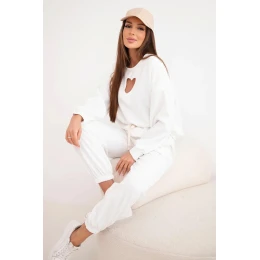 Tento roztomilý dámský sportovní komplet masełko okouzluje svou originalitou a pohodlím nošení. Mikina s jemným výřezem ve tvaru srdce na výstřihu dodává dívčí kouzlo a odlišuje tento model od klasických sportovních sad. Kalhoty s elastickým pasem a stahovacími manžetami zaručují dokonalé přizpůsobení a pohodlí po celý den.