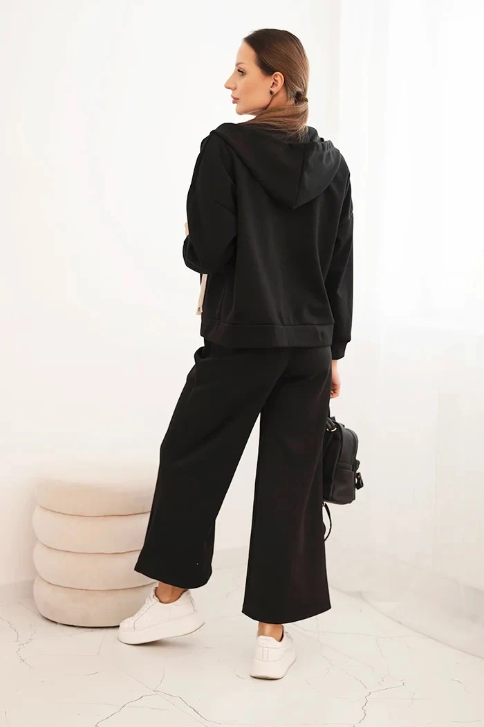 Dámská souprava máslo s širokými nohavicemi a mikinou na zip černý