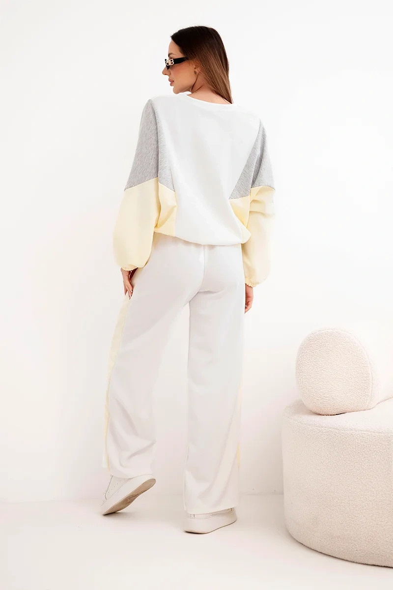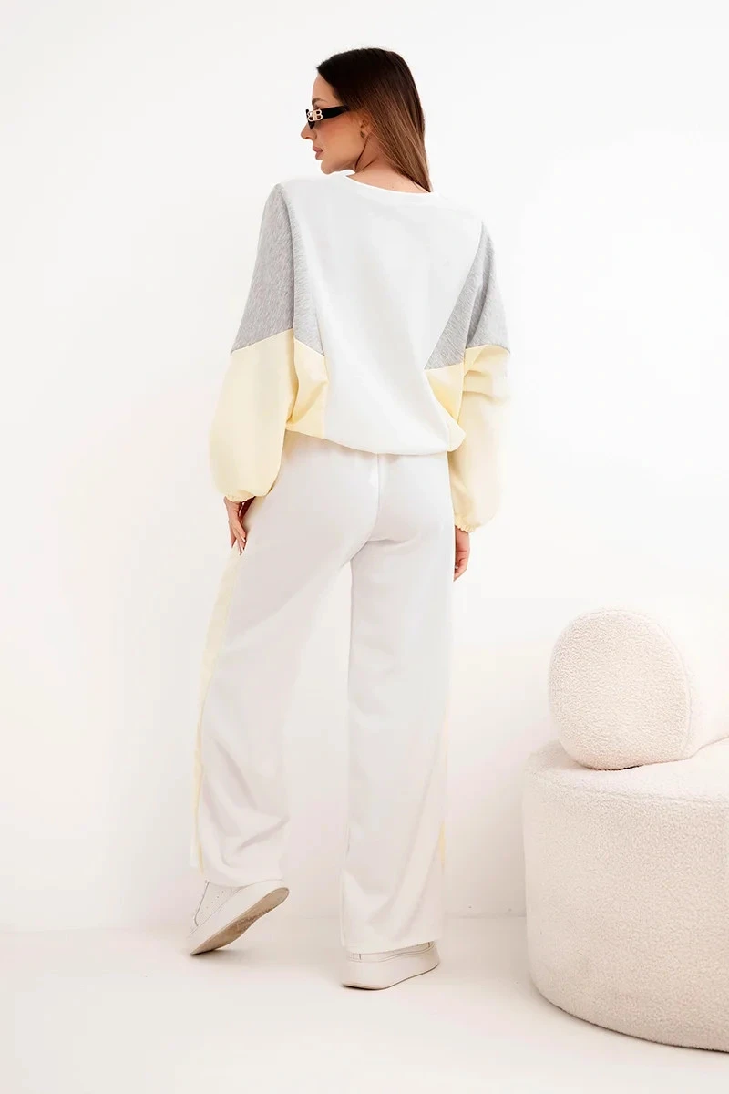 Mikina volného střihu s nízkou linií ramen a elastickými manžetami na rukávech zajišťuje volnost pohybu a výjimečné pohodlí. Kontrastní vsadky jí dodávají módní, moderní charakter. Kalhoty s elastickým pasem a širokým střihem garantují komfort po celý den a jejich minimalistický střih krásně zdůrazňuje siluetu.