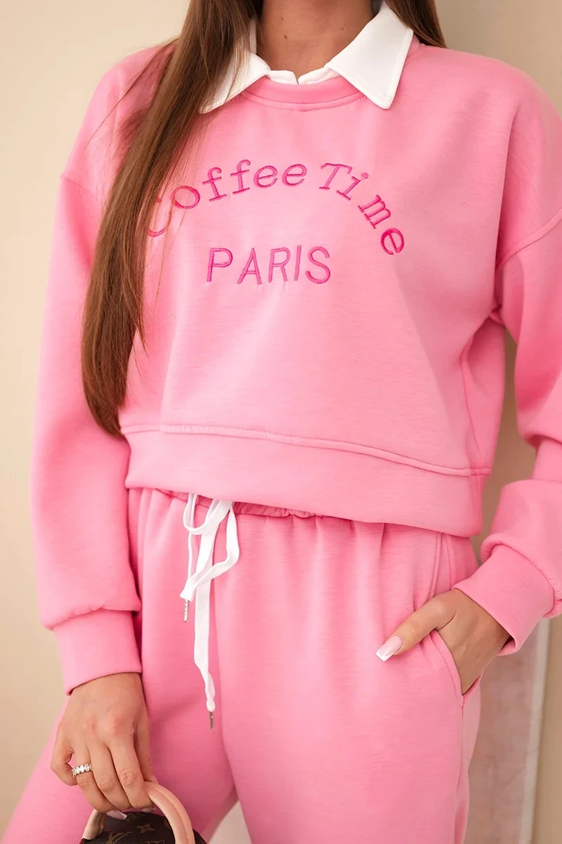 Pohodlná a stylová dámská souprava tepláková je must-have v každém dámském šatníku! Tento dvoudílný set typu „máslový” okouzluje měkkostí materiálu a módním vzhledem. Vrchní část tvoří mikina s vyšitým nápisem "Coffee Time PARIS", klasickým límečkem a sníženou linií ramene, která celku dodává sportovně-elegantní charakter.