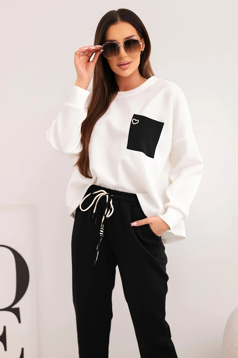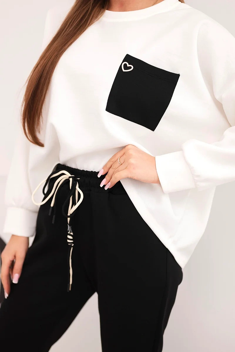 Stylový a pohodlný dámský souprava tepláková je ideální nabídkou pro ženy, které oceňují komfort a módní vzhled. Mikina z měkkého materiálu volného střihu byla obohacena o kontrastní kapsičku s roztomilým akcentem ve tvaru srdíčka, což dodává celku ženský půvab. Kalhoty s elastickým pasem a tkaničkami zajišťují dokonalé přizpůsobení postavě a plnou svobodu pohybu.