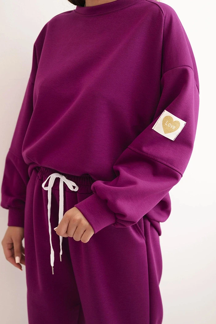 Dámská souprava máslová s volnou mikinou a kalhotami s nápisem LOVE tmavě fialová