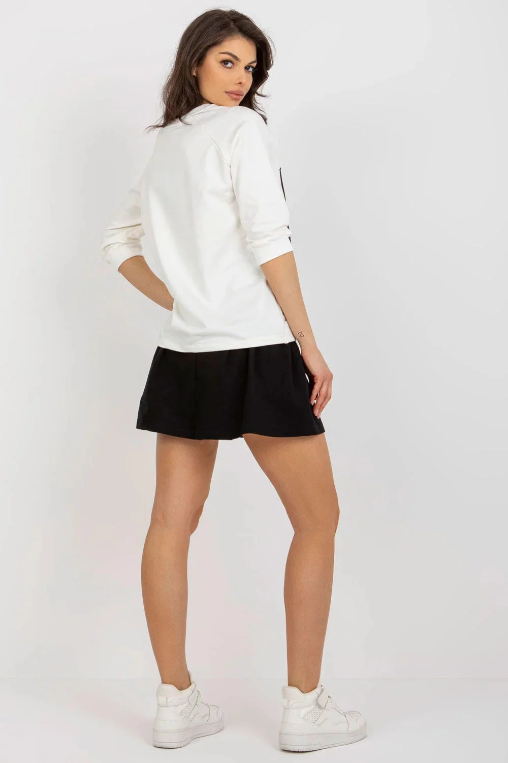 Tepláková souprava sestávající z halenky a sukně. Halenka s 3/4 rukávy a kulatým výstřihem. Ozdobný potisk na přední straně. Sukně s vyšším pasem, zapínáním na zip a knoflík.