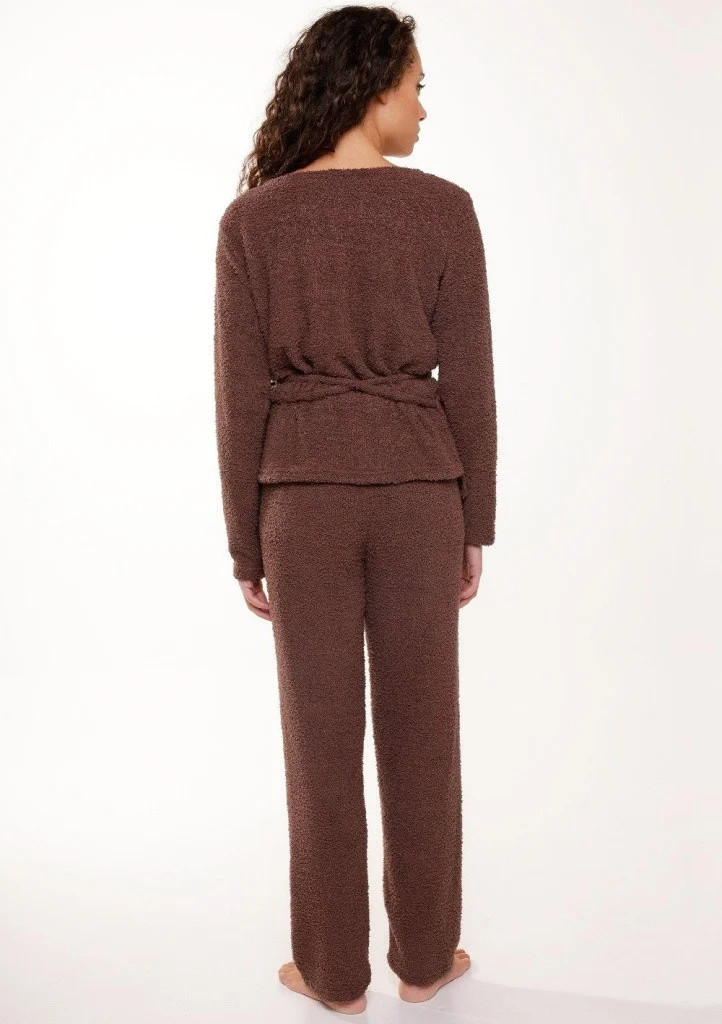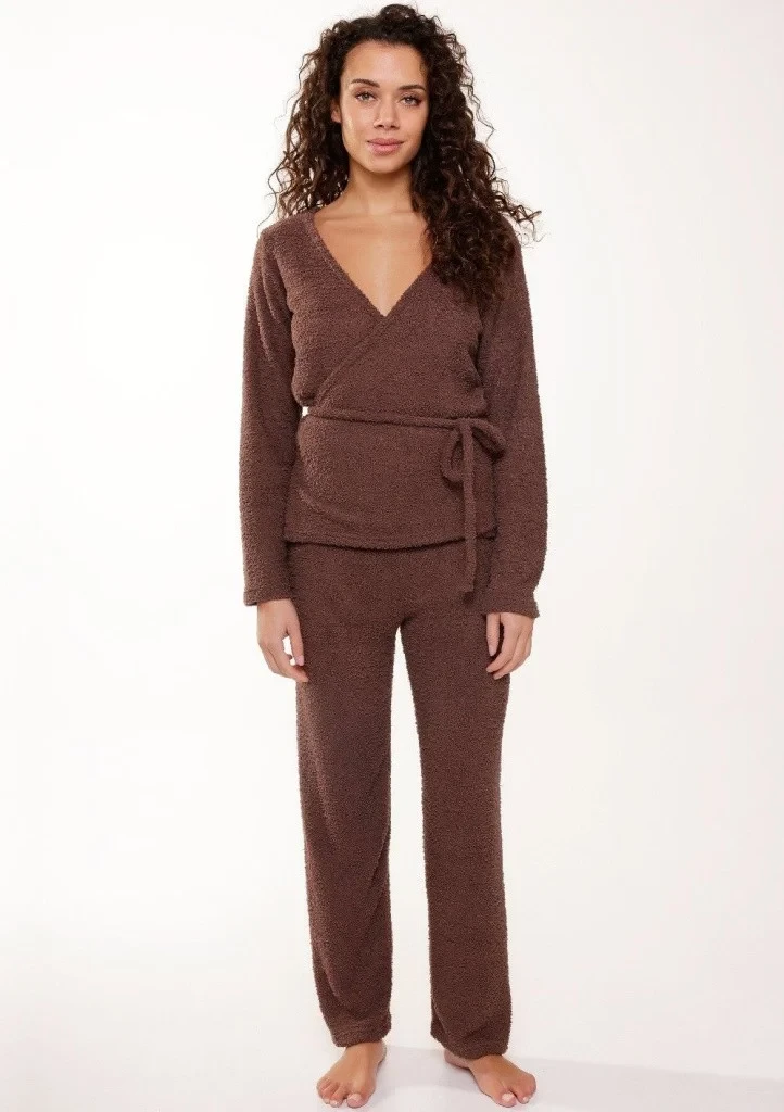 Dámská souprava značky Lingadore. Souprava obsahuje kabátek, který je zavinovací kolem obvodu těla. Výstřih kabátku je do "V", rukávy jsou ukončené volně. Kalhoty jsou volného rovného střihu. V pase jsou kalhoty do širší obšité gumy. Celá souprava je příjemné hřejivá a ideální do chladných dnů.