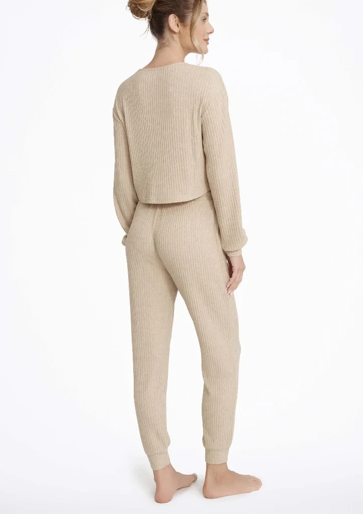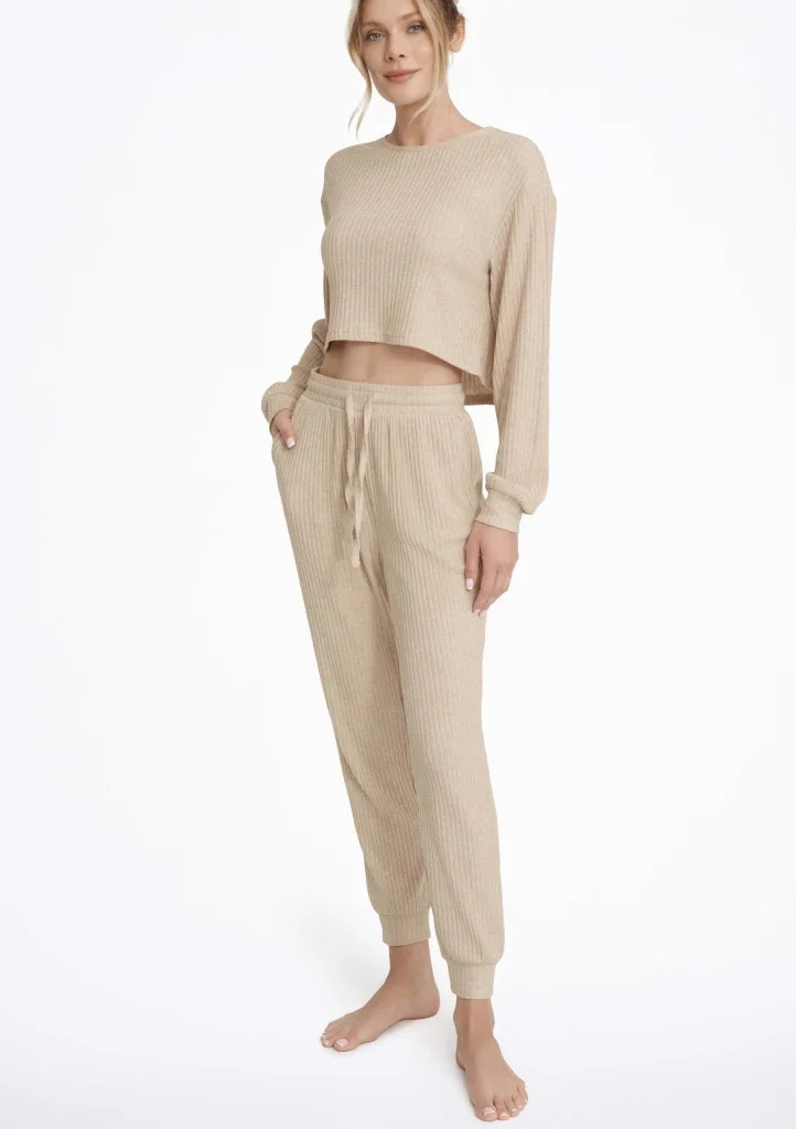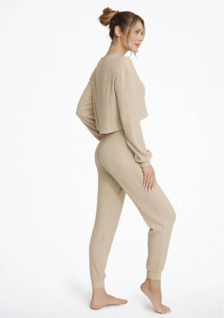 Dámská souprava od značky Esotiq. Souprava je velmi jemná a lehká. Tričko má dlouhý rukáv, je kratší a volné. Rukávy jsou ukončeny úpletem. Kalhoty jsou volné, mají zapuštěné kapsy a v pase mají širokou pohodlnou gumu i se šňůrkou na zavazování. Souprava je velmi pohodlná na doma i na ven a byla navrhnuta módní návrhářkou Eva Minge.