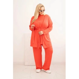 Stylový a mimořádně pohodlný dámský 3-dílný komplet je vynikající nabídkou pro ženy, které si cení komfortu, módního vzhledu a praktičnosti. Sada obsahuje: zavazovací cardigan, volnou blůzu s krátkým rukávem a kalhoty se širokou nohavicí a elastickým pasem. Celý komplet je vyroben z měkkého, žebrovaného materiálu, který se krásně přizpůsobuje postavě a zajišťuje pohodlí po celý den.
