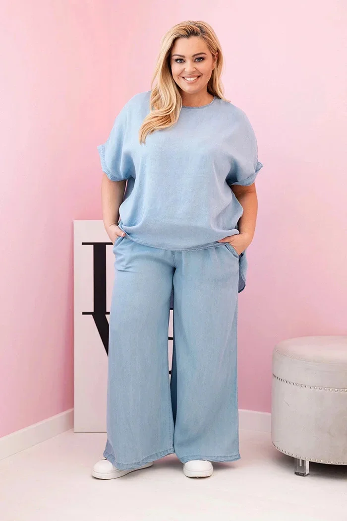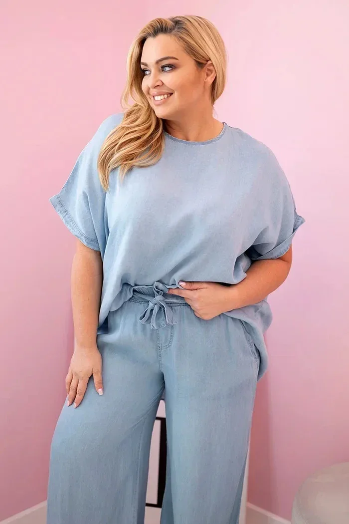 Stylová a pohodlná dámská Plus Size souprava z přírodního tencelu je ideální volbou na léto a každodenní outfity. Sada se skládá z volné halenky s asymetrickým střihem a kalhot se širokými nohavicemi a dekorativním vázáním v pase. Tkanina tencel je měkká, prodyšná a příjemná na dotek – zajišťuje pohodlí i v těch nejteplejších dnech. Volný střih a elastický pas zajišťují, že souprava perfektně sedí na postavě Plus Size, zvýrazňuje přednosti postavy a zakrývá nedostatky. Skvělá volba na každý den, dovolenou, do práce nebo na volné schůzky s přáteli.