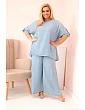 Stylová a pohodlná dámská souprava ze 100% tencelu je ideální volbou pro teplé dny. Volná halenka s kulatým výstřihem a zavazováním na rukávech působí lehce a uvolněně, asymetrický střih jí dodává jedinečný charakter. Kalhoty se širokými nohavicemi, pružným pasem a zavazovacím páskem zajišťují pohodlí a skvěle sedí na postavě. Tato sada je ideální na každý den, na dovolenou nebo na neformální společenská setkání. Přírodní tkanina z tencelu je prodyšná, jemná na pokožku a velmi příjemná na dotek. Spojte pohodlí a módní design. Model je určen dámám, které nosí velikosti Plus Size – XXL, XXXL a větší.