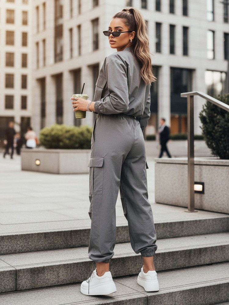Překvapte všechny svým stylem s dámskou soupravou ROTVE, která je synonymem městské ležérnosti a funkčnosti. Bunda bomber s velkými kapsami a široké cargo kalhoty jsou ideální kombinací pro každou ženu, která si cení pohodlí a módního vzhledu. Žebrované lemy zajišťují dokonalé padnutí a pohodlí při nošení. Ideální pro přechodné období.