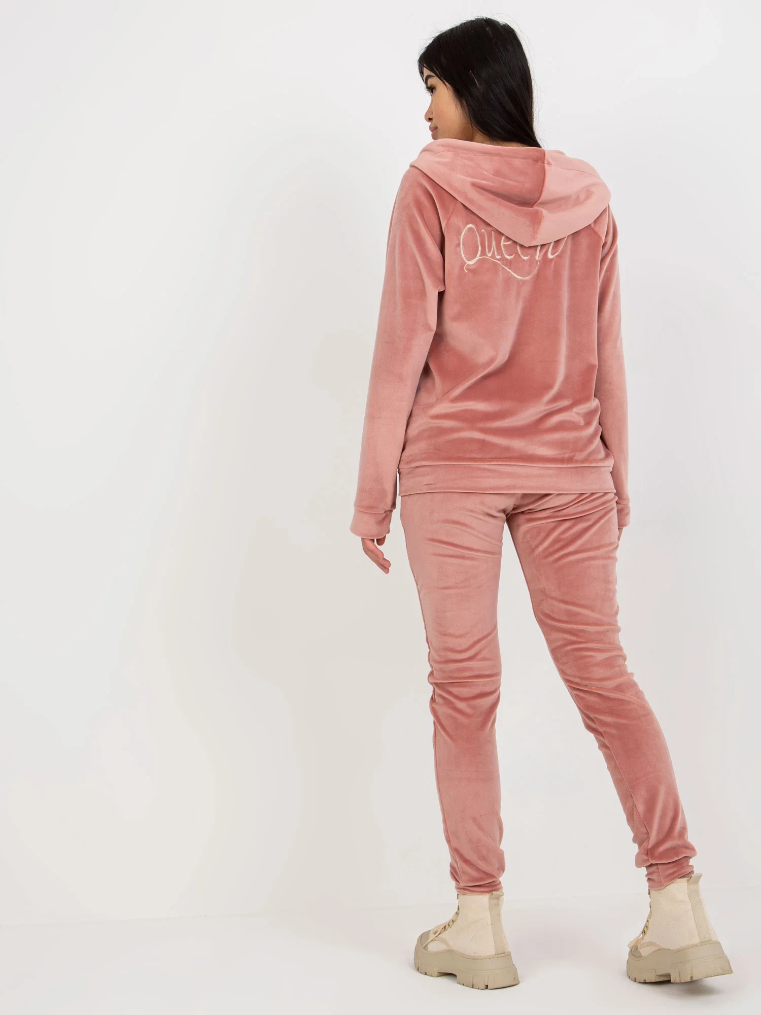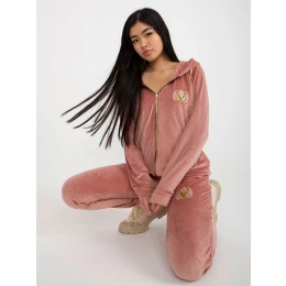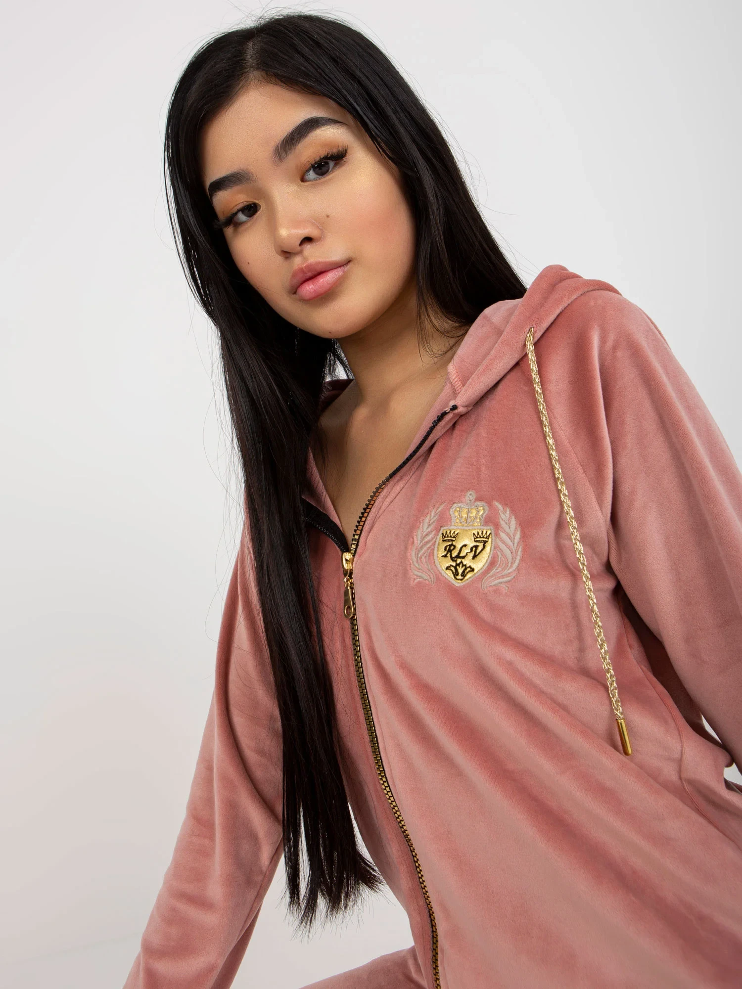 Špinavě růžová dámská velurová souprava s nášivkami .