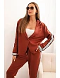 Moderní dámská souprava s viskózou je ideálním řešením pro ženy, které ocení módu a pohodlí v jednom. Sportovní sako volného střihu s kontrastními lampasy na rukávech skvěle ladí s kalhotami s elastickým pasem a bočními lampasy. Celkově vytváří casual, ale zároveň stylový outfit, který se hodí jak na každodenní nošení, tak do méně formálních stylizací do práce nebo na schůzku.