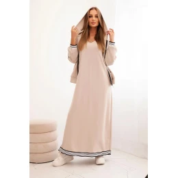 Pohodlný a módní dámský komplet z viskózy, který se skládá z dlouhé šaty a krátké mikiny s kapucí a zipem. Šaty mají jednoduchý střih s jemně rozšířeným spodním lemem, díky čemuž se skvěle přizpůsobují postavě. Mikina s praktickými kapsami a kontrastními náplety dodává sportovní charakter a činí, že souprava vypadá moderně a uvolněně.