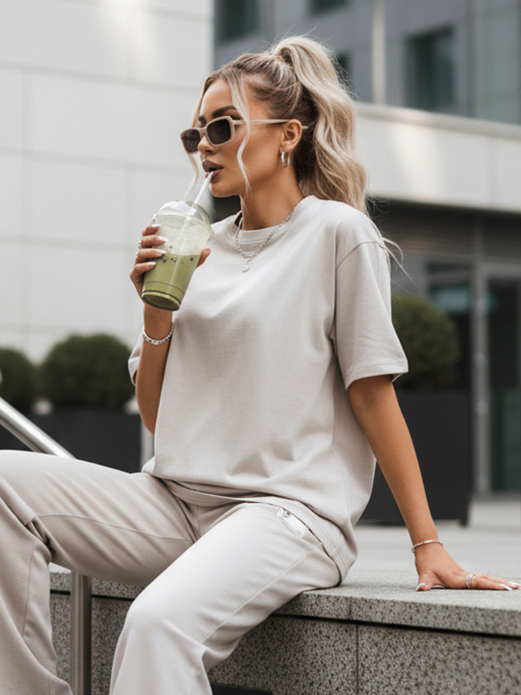 Vyjádřete sebe a svou individualitu výběrem soupravy BLISES, která podtrhne vaši osobnost. Volné tričko dobře ladí s širokými kalhotami a vytváří tak vzhled, který je pohodlný a zároveň trendy. Nášivky dodávají charakter a kalhoty s vysokým pasem a nastavitelným elastickým lemem zajišťují celodenní pohodlí. Ať už se jedná o jakoukoli příležitost, v této soupravě se budete cítit pohodlně a módně.
