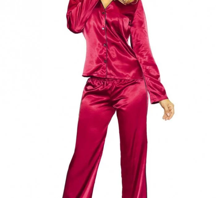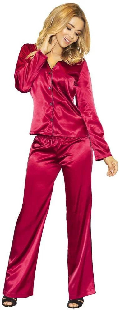 Klasické pyžamo z jemného saténu, které by nemělo chybět v žádném dámském šatníku. Halenka s dlouhými rukávy a knoflíky má na obou stranách půvabné praskliny. Je zdobena záložkou v kontrastní barvě a malou kapsou. Kalhoty mají mírně širší střih nohavic pro větší pohodlí. Boční strany nohavic zdobí pruh ze stejné vsadky jako ozdoby na halence. Termi je tradiční dámské pyžamo, které je díky svému klasickému střihu ideální i jako dárek.