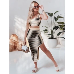 Tento dámský pruhovaný komplet je ideální pro teplejší dny. Krátký top se silnějšími ramínky a klasickým výstřihem má moderní vzhled, zatímco vypasovaná maxi sukně s vysokým pasem a poutavým rozparkem dodává charakter. Pruhovaný vzor opticky zeštíhluje siluetu. Univerzální velikost je vhodná pro velikosti XS až L. Materiál je příjemný na dotek, pružný a dokonale se přizpůsobí tělu, což zajišťuje volnost nošení v teplých dnech.