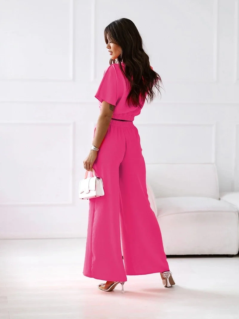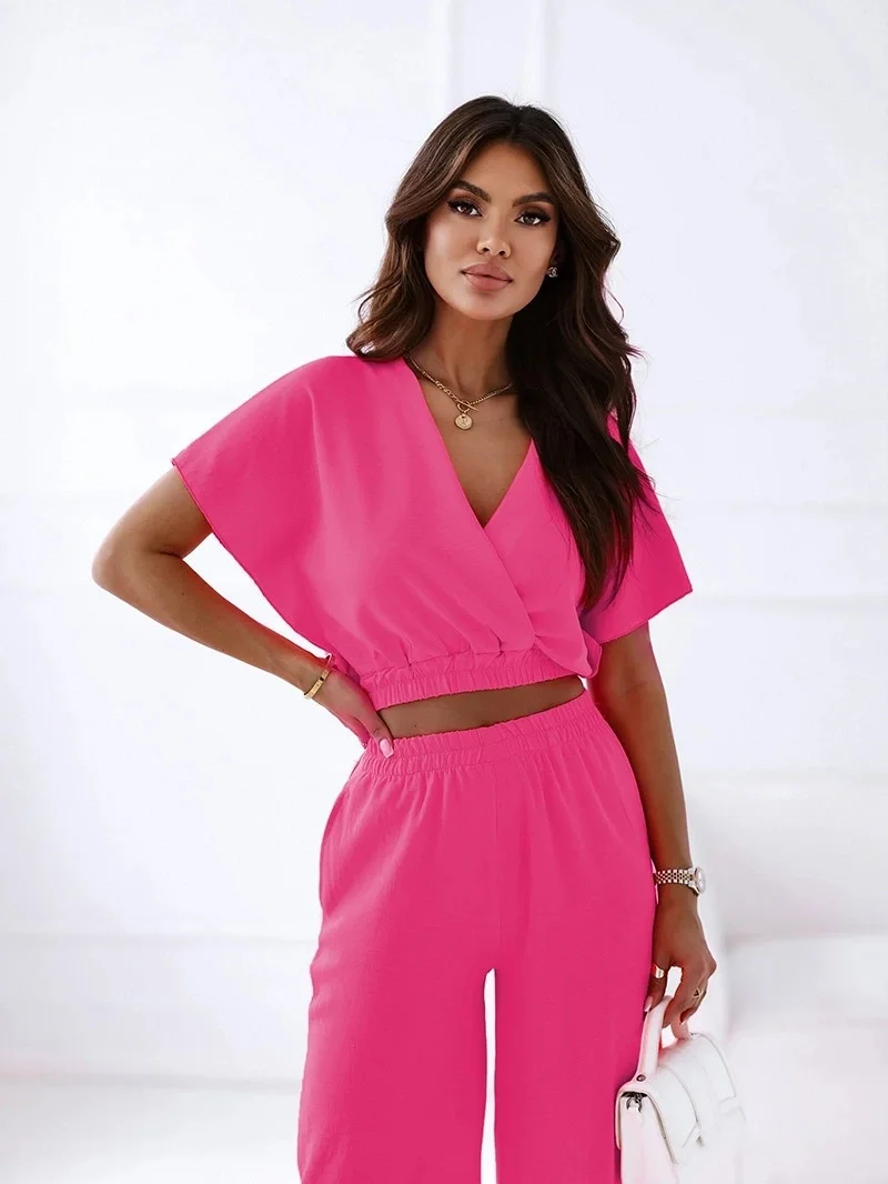 Dámská souprava ve fuchsijové barvě - přeložený obálkový top a široké kalhoty (8178)