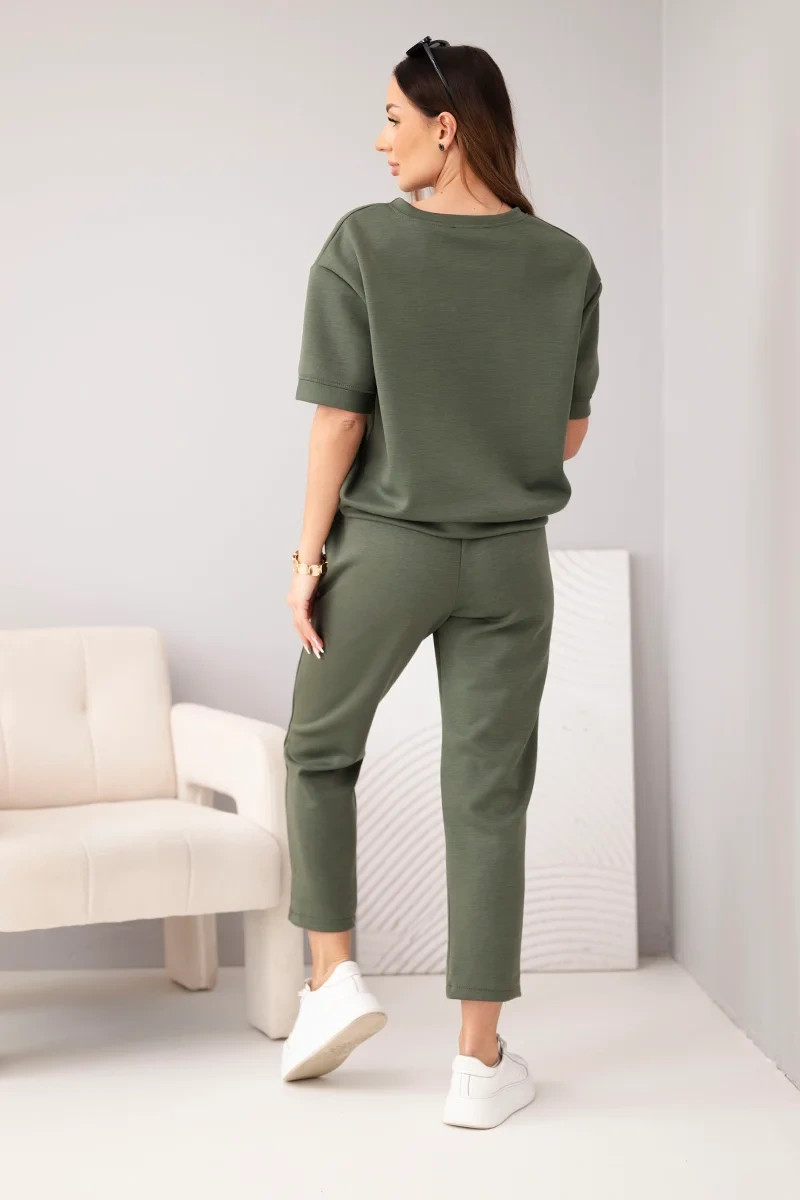 Dámská souprava viskózová máslová s krátkým rukávem a kalhotami s ohrnutým nohavicí khaki