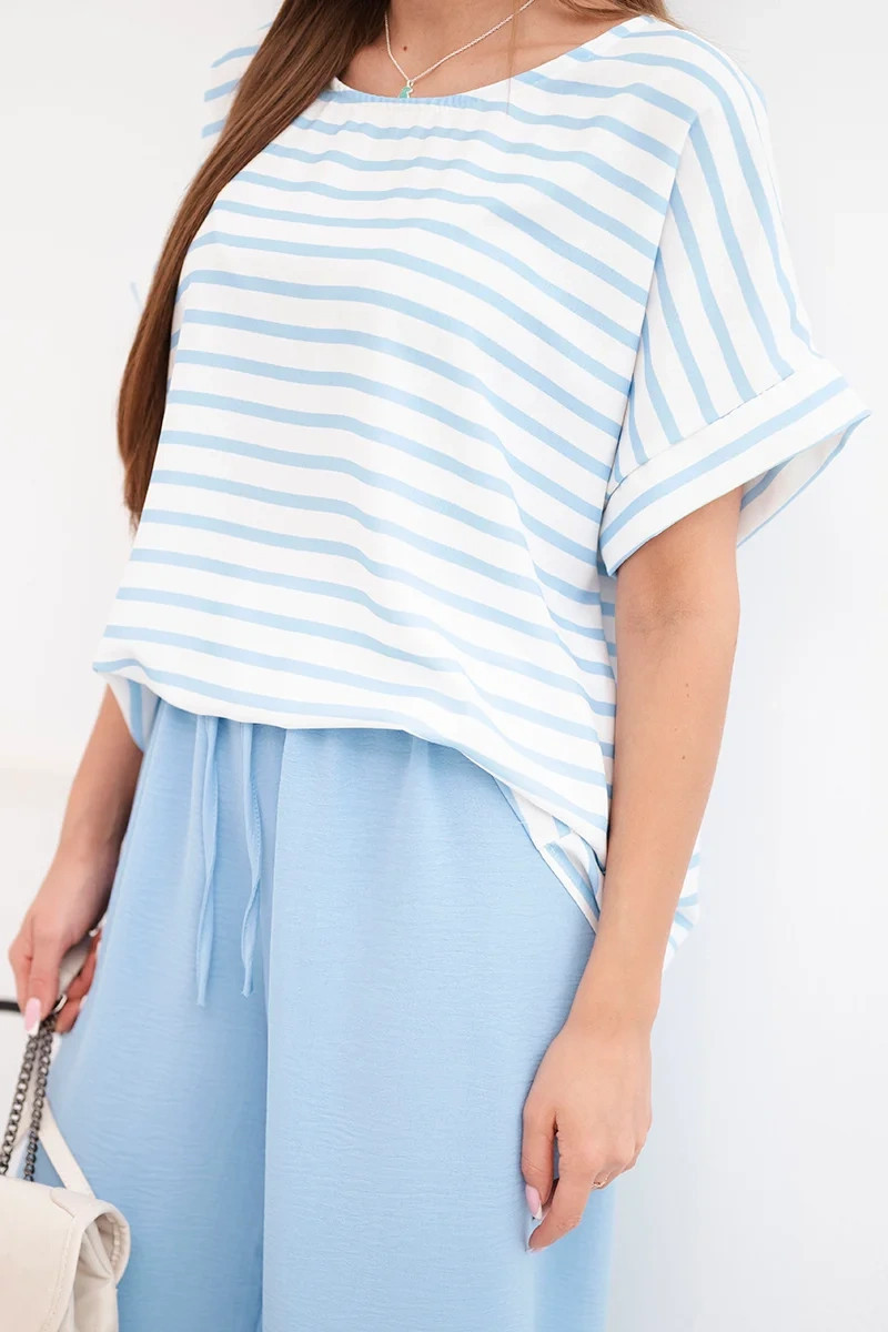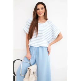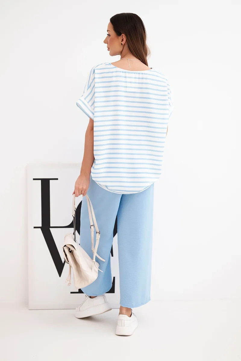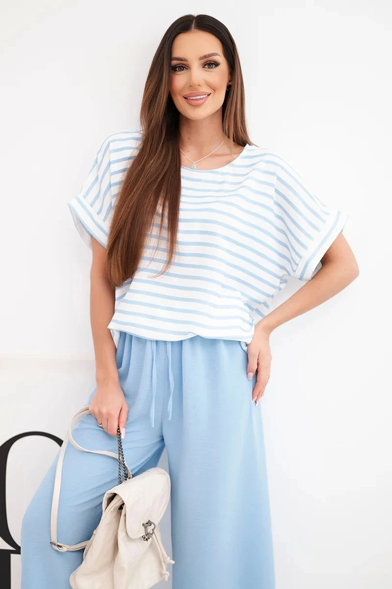 Dámská souprava viskózová s pruhovanou blůzou a širokými kalhotami s gumou modrý