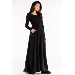 Trapézová maxi sukně, v pase vypasovaná do gumy. Sukně má vpředu nařasené kapsy a na bocích ozdobný výřez s volánky. Složení materiálu: 95% bavlna, 5% elastan Modelka je 172 cm vysoká, prezentovaná velikost: 36 (S) Prát na 30 stupňů v jemném pracím prostředku, nebělit, nesušit v sušičce. Žehlete při nízké teplotě.