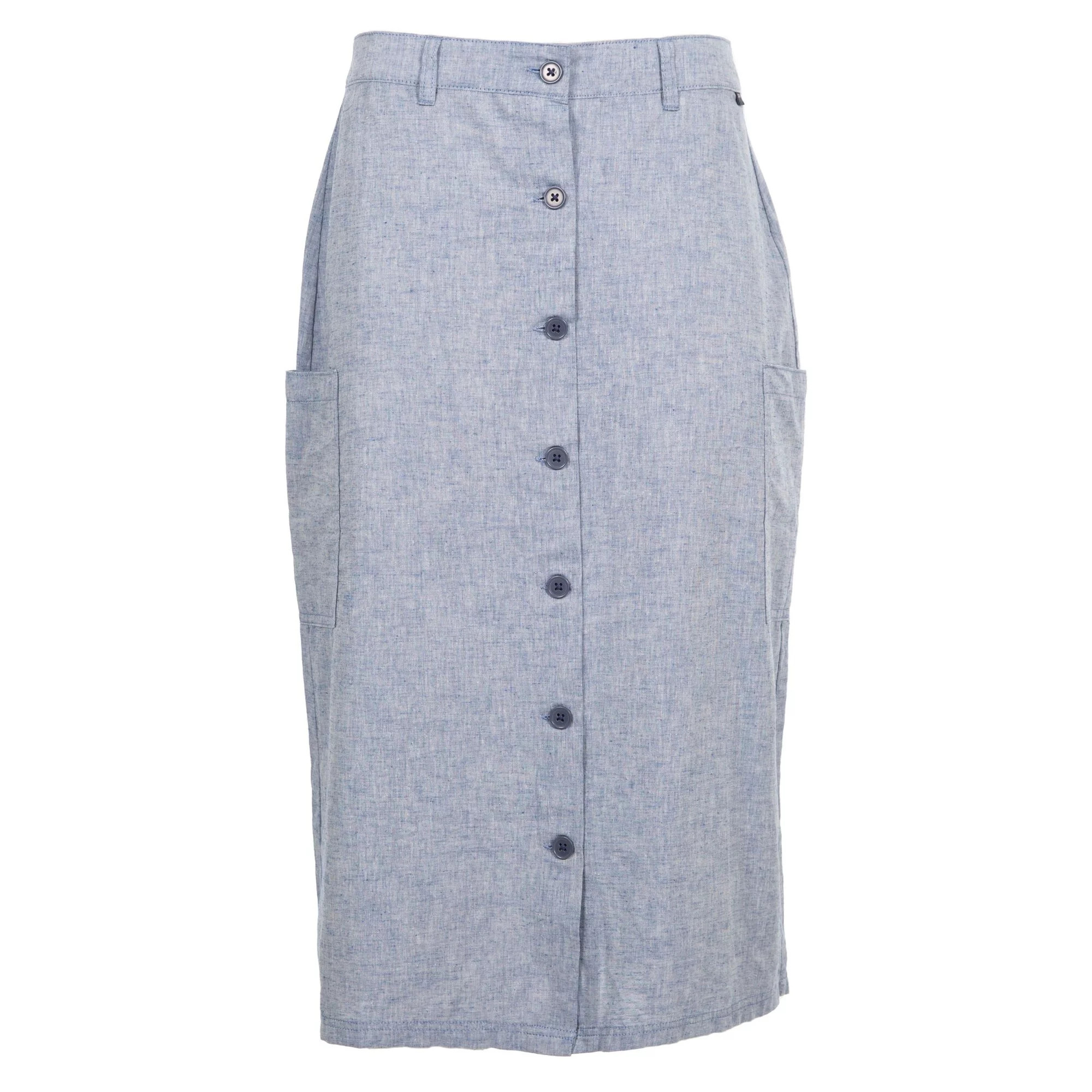 Dámská dlouhá sukně s knoflíky v celé délce, plochým pasem a poutky na opasek.