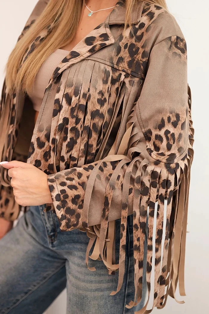 Dámská semišová bunda s leopardím vzorem a třásněmi je ideální volbou pro ženy, které se rády vyčnívají stylovým a odvážným vzhledem. Efektní leopardí vzor spojený s dlouhými třásněmi vytváří jedinečný boho charakter s nádechem rockového klimatu.