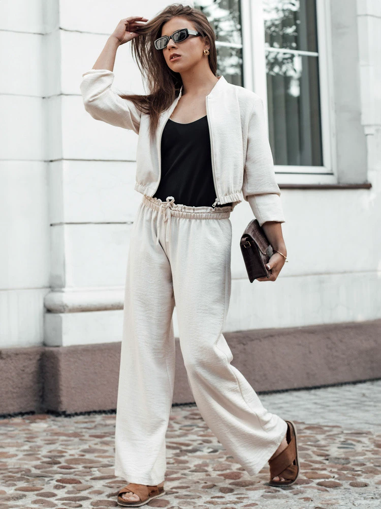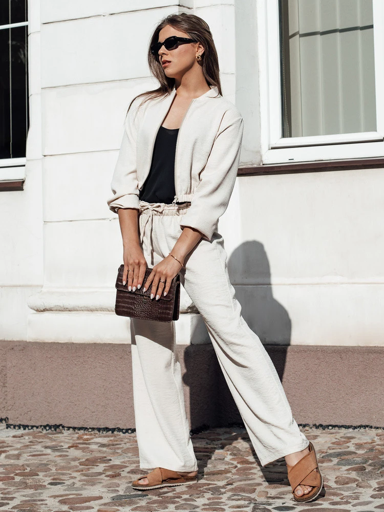 Tato nadčasová bunda typu bomber se stojáčkem, zapínáním na zip a žebrovanými manžetami a lemem je ideálním doplňkem k mnoha outfitům. Je vyrobena z vysoce kvalitní tkaniny a tvoří dokonalý komplet s kalhotami MADDIE.