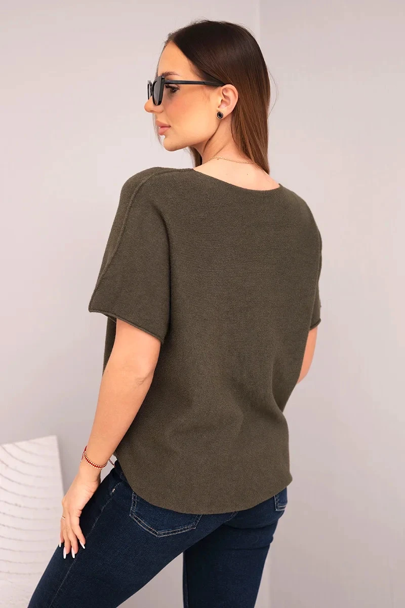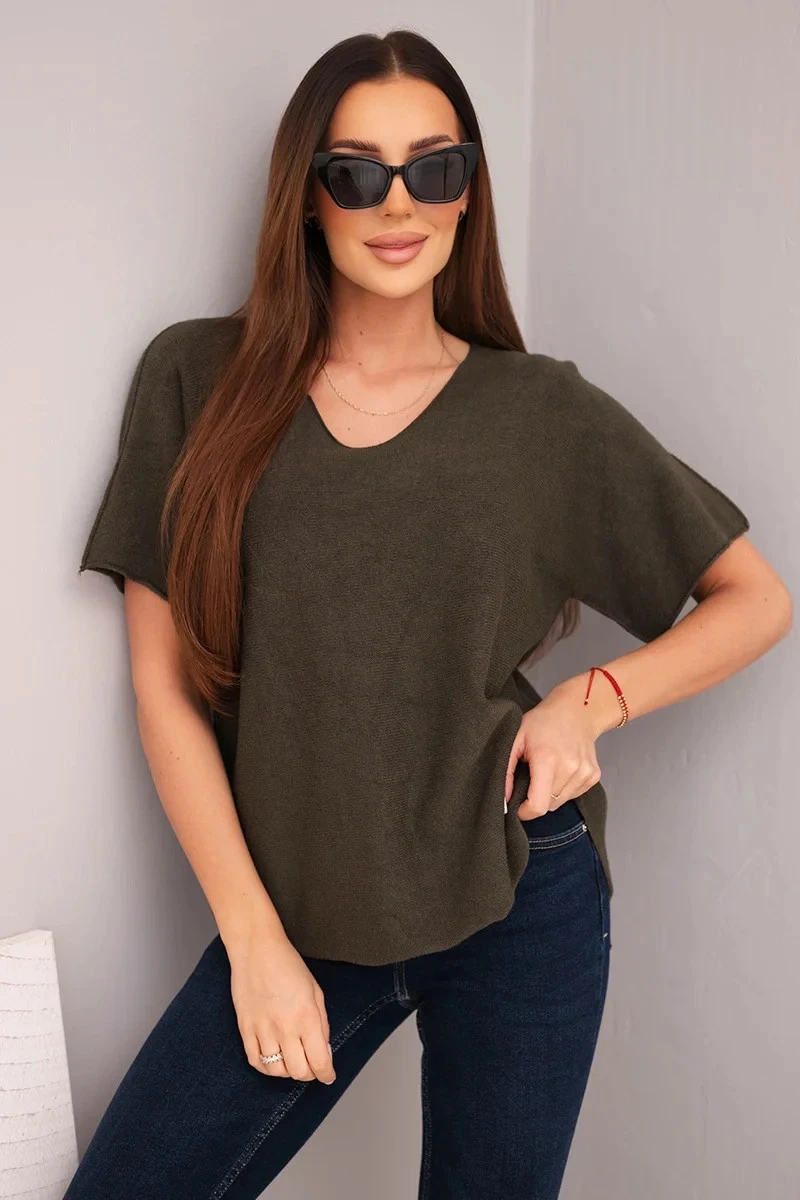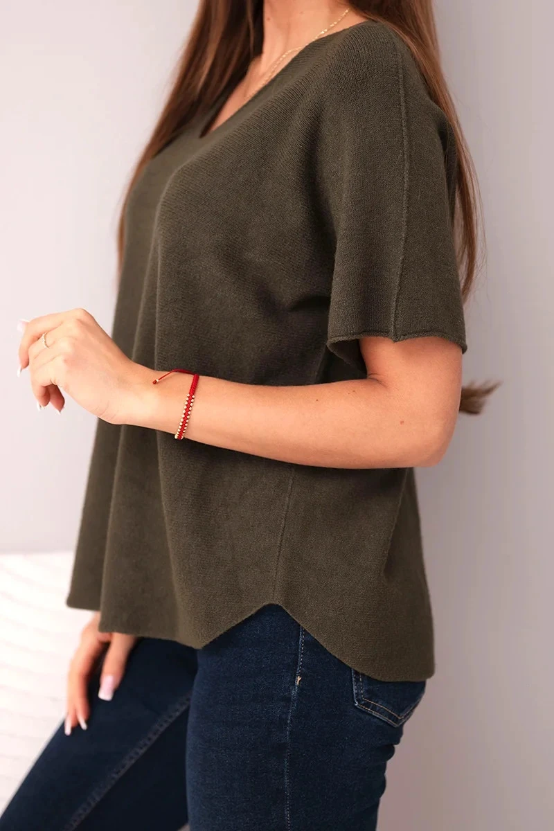 Dámská svetr s krátkým rukávem a výstřihem do V khaki