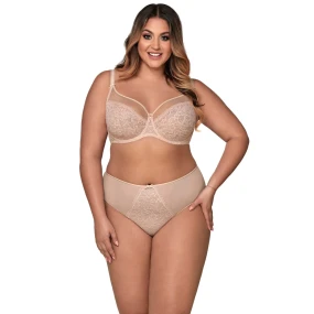 Beżowy biustonosz AV 1396 to doskonała propozycja dla kobiet szukających uniwersalnej, komfortowej i jednocześnie zmysłowej bielizny. Wykonany z transparentnej siateczki i subtelnej koronki, harmonijnie łączy elegancję z codzienną funkcjonalnością. Miękka konstrukcja z pełniejszą miską idealnie sprawdza się przy większym biuście – zapewnia naturalne ułożenie piersi i komfort bez dodatkowego usztywnienia. Model wyposażony jest w fiszbiny, które dobrze stabilizują biust i podtrzymują go przez cały dzień. Charakterystyczne detale – złoty element biżuteryjny na mostku i dekoracyjny paseczek nad miseczkami – dodają całości lekkości i stylu. Tył z gładkiego tiulu, zapięcie na haftki oraz regulowane ramiączka gwarantują wygodne dopasowanie. Kolor nude sprawia, że stanik jest niewidoczny pod jasnymi ubraniami.