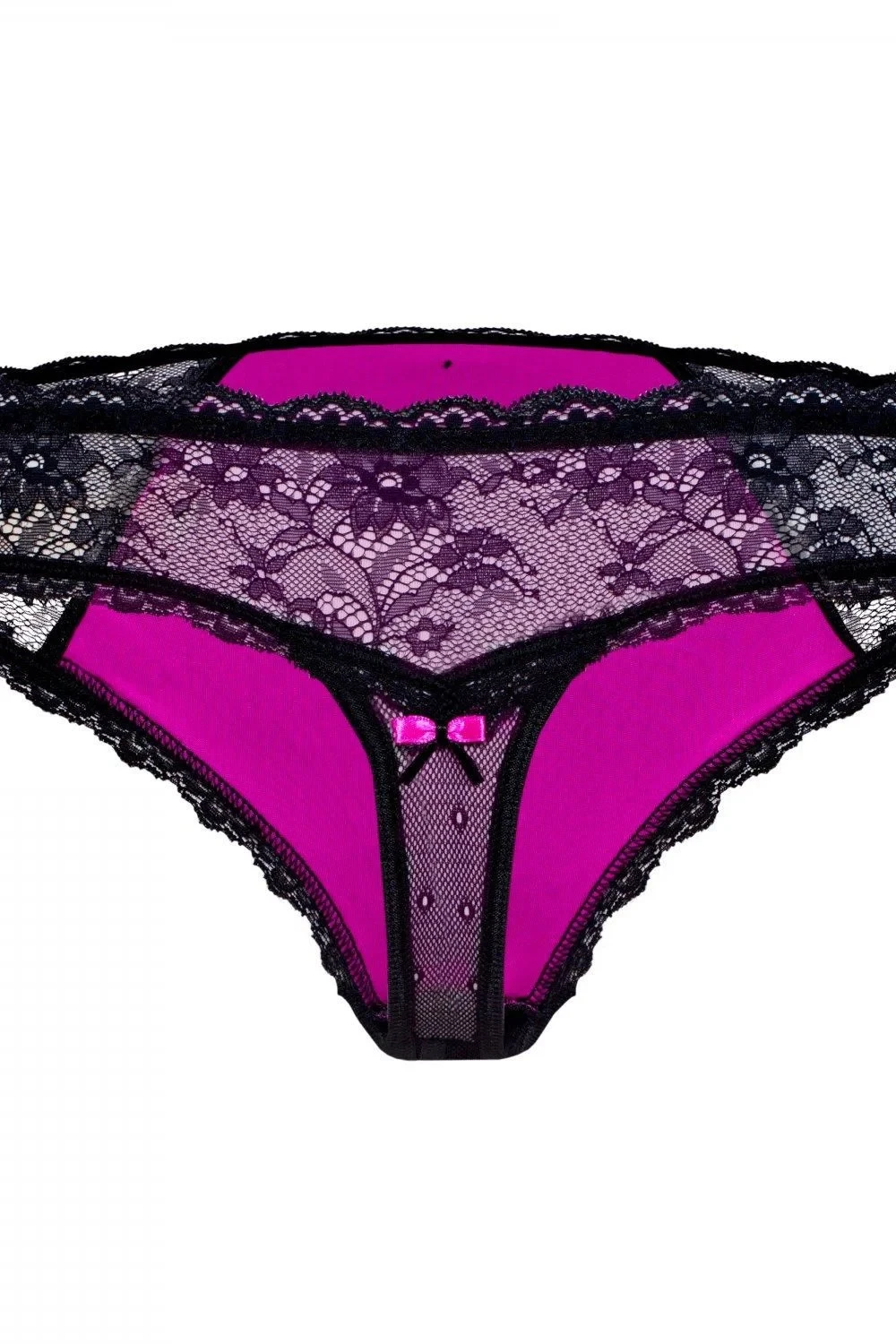 Dámská tanga Fifii ROZA - černá barva - vyrobená z krajky s květinovou výšivkou - ozdobná mašle ve fialové barvěMateriálové složení: 75% polyamid + 20% elastan + 5% bavlna