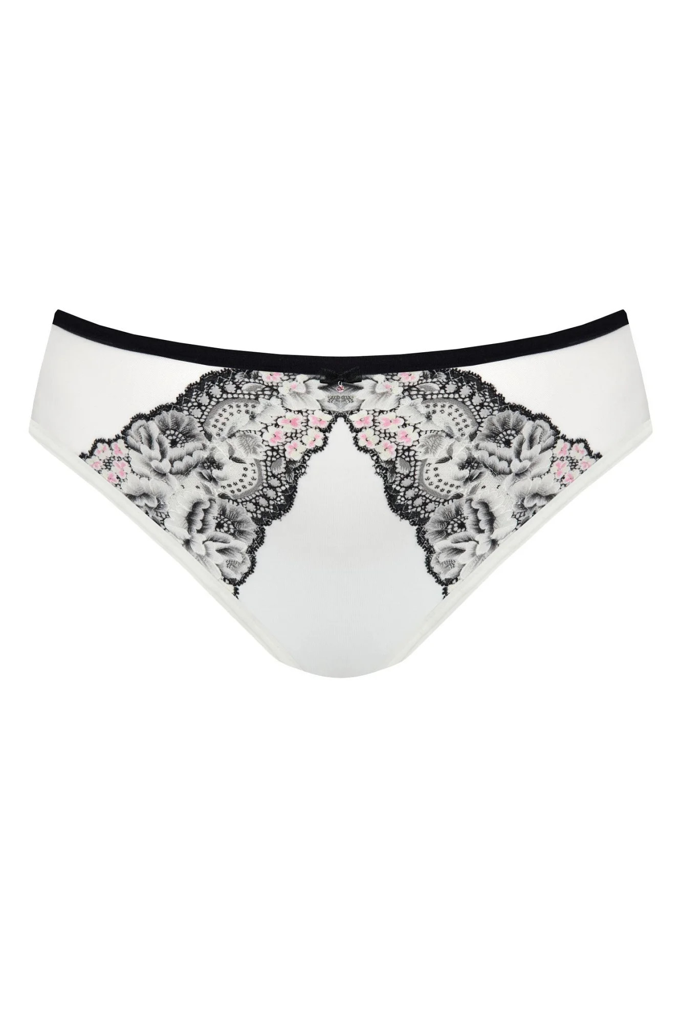 Dámská tanga 842 Black & white GORSENIA - bílá barva - z kvalitního neprůsvitného mikrovlákna - klasický střih - přední část zdobená tylovou síťovinou a krajkou s květinovým motivem - zadní část zakončená krajkou - linie pasu z černé elastické pásky