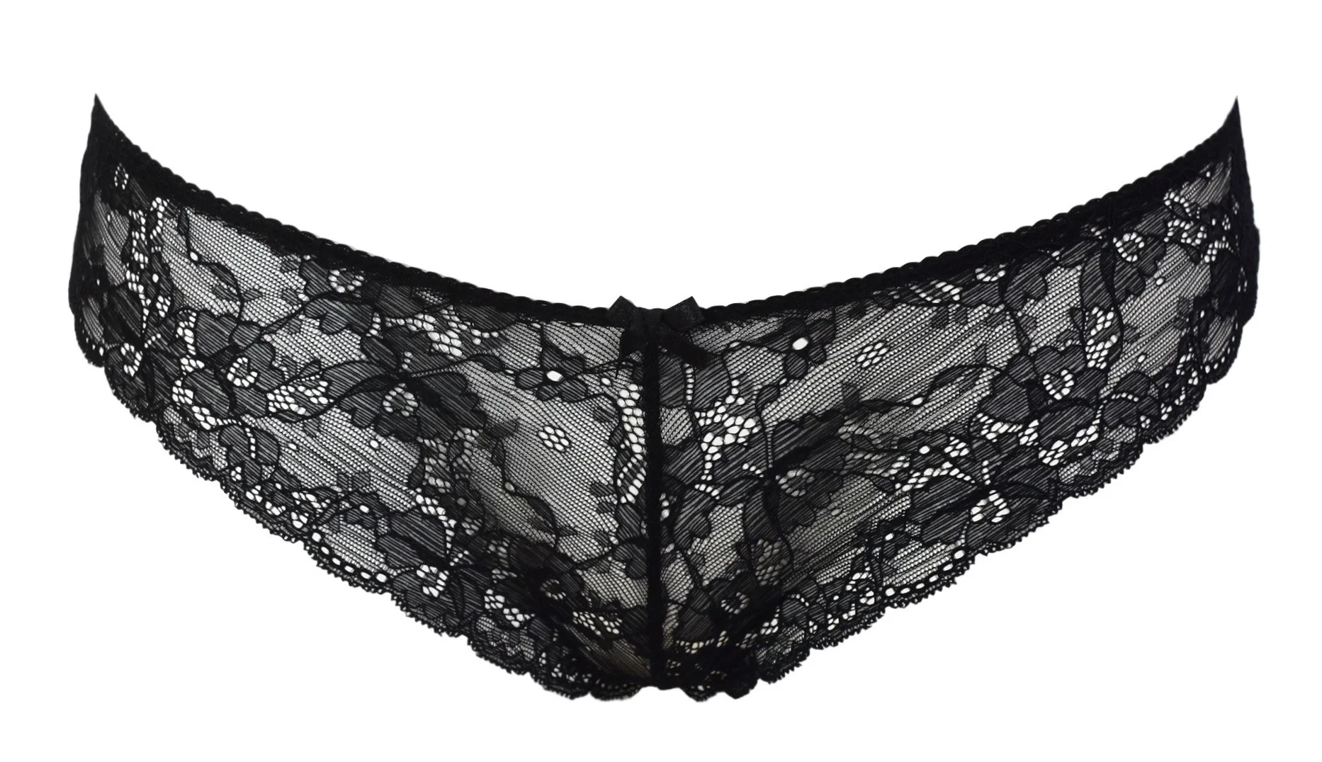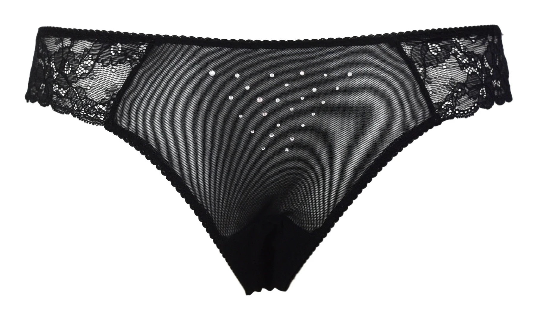 Dámské kalhotky string (tanga). Kalhotky jsou vyrobené z jemného tylu a ve přední části jsou ozdobené lesklými kamínky. Boky modelu a zadní díl jsou ušité z ažurové krajky s květinovým motivem.