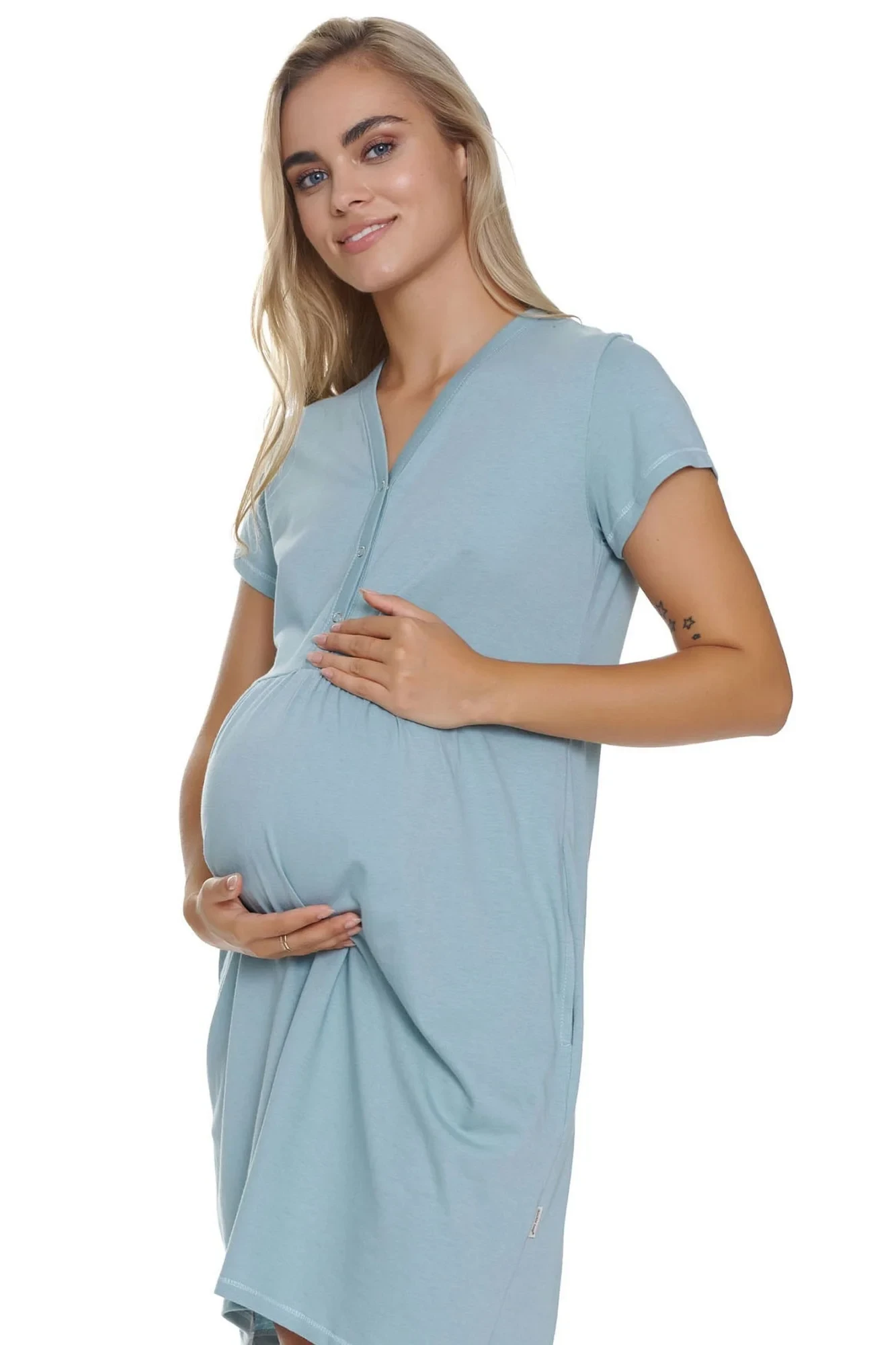 Dámská těhotenská košile 5336 Doctornap - světle modrá barva - z vysoce jakostní bavlny - s krátkými rukávy - zapínání na patentky - na bocích kapsy - spodní část s ozdobným řasením - ideální pro těhotné a kojící ženy - certifikát OEKO-TEX Standard 100