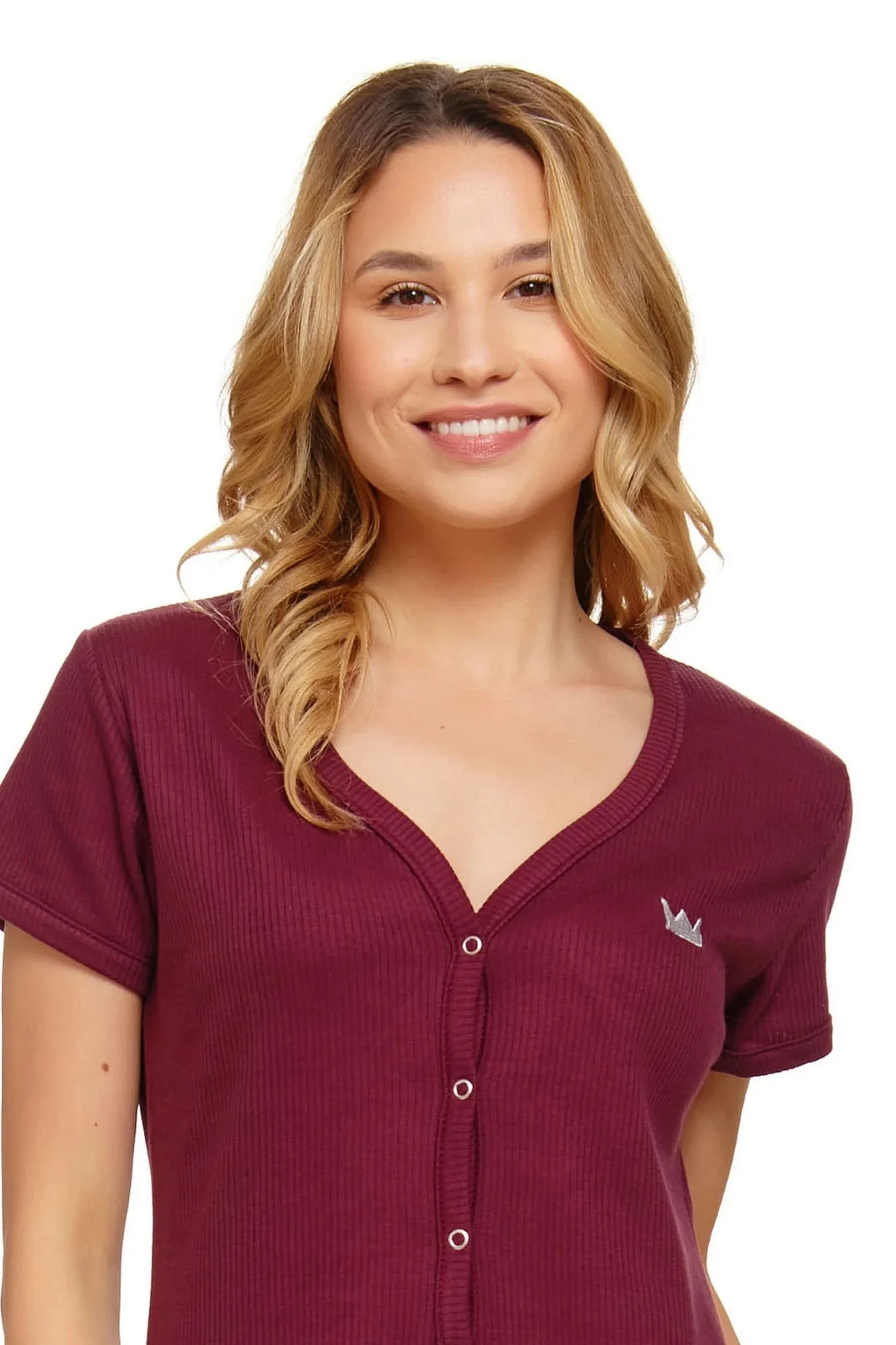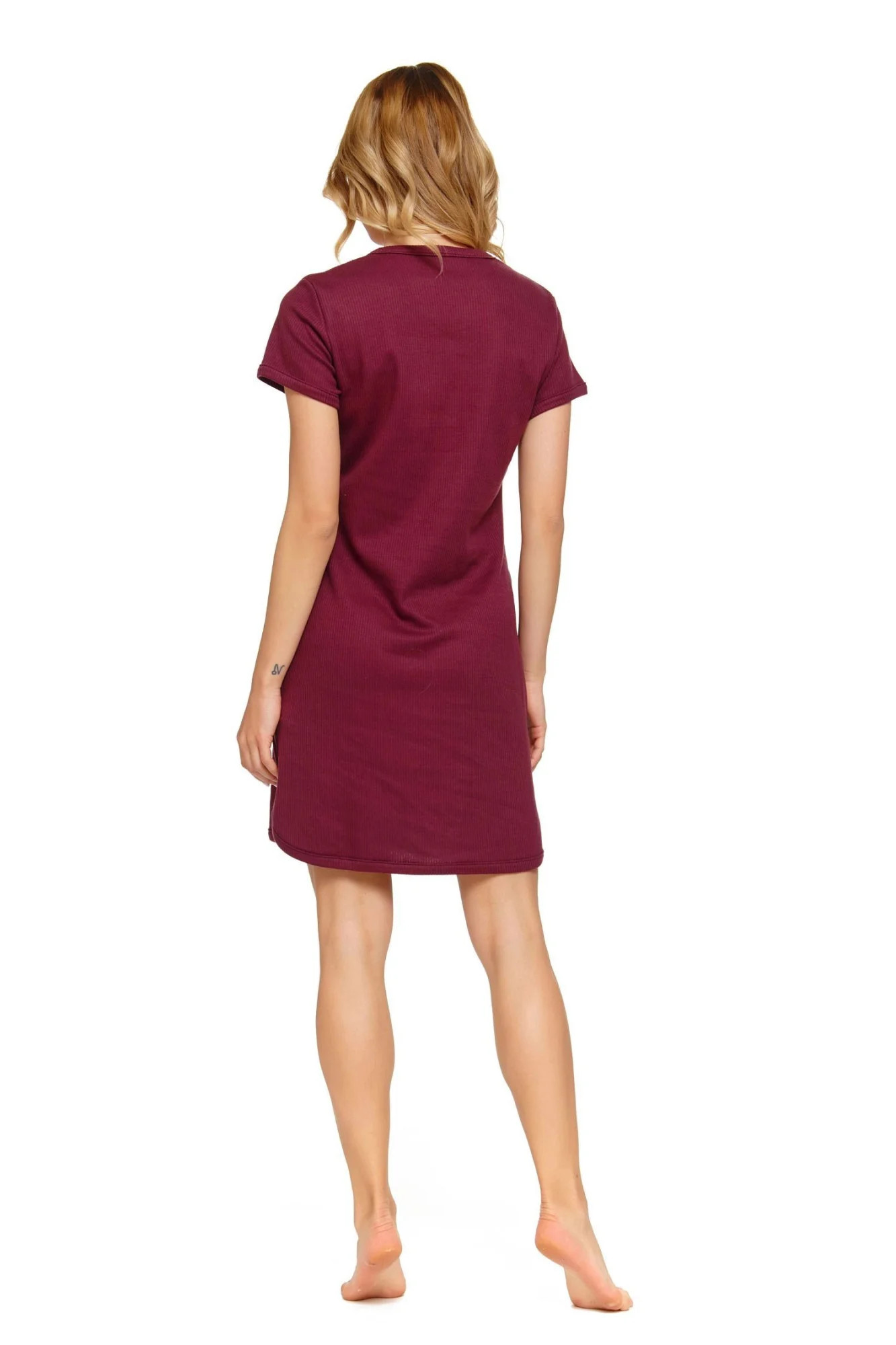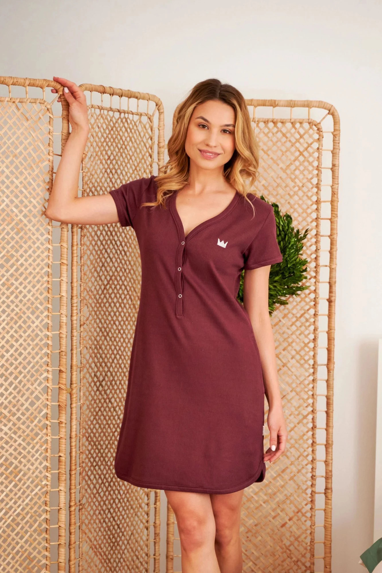 Dámská těhotenská košile 4115 wine Doctornap - bordó barva - z vysoce jakostní bavlny - na prsou zdobená nášivkou - výstřih se zapínáním na patentky - krátké rukávy - kapsy na bocích - ideální pro těhotné a kojící - hypoalergenní - certifikát OEKO-TEX Standart 100