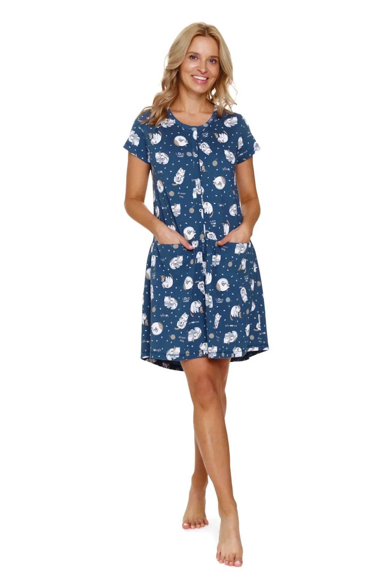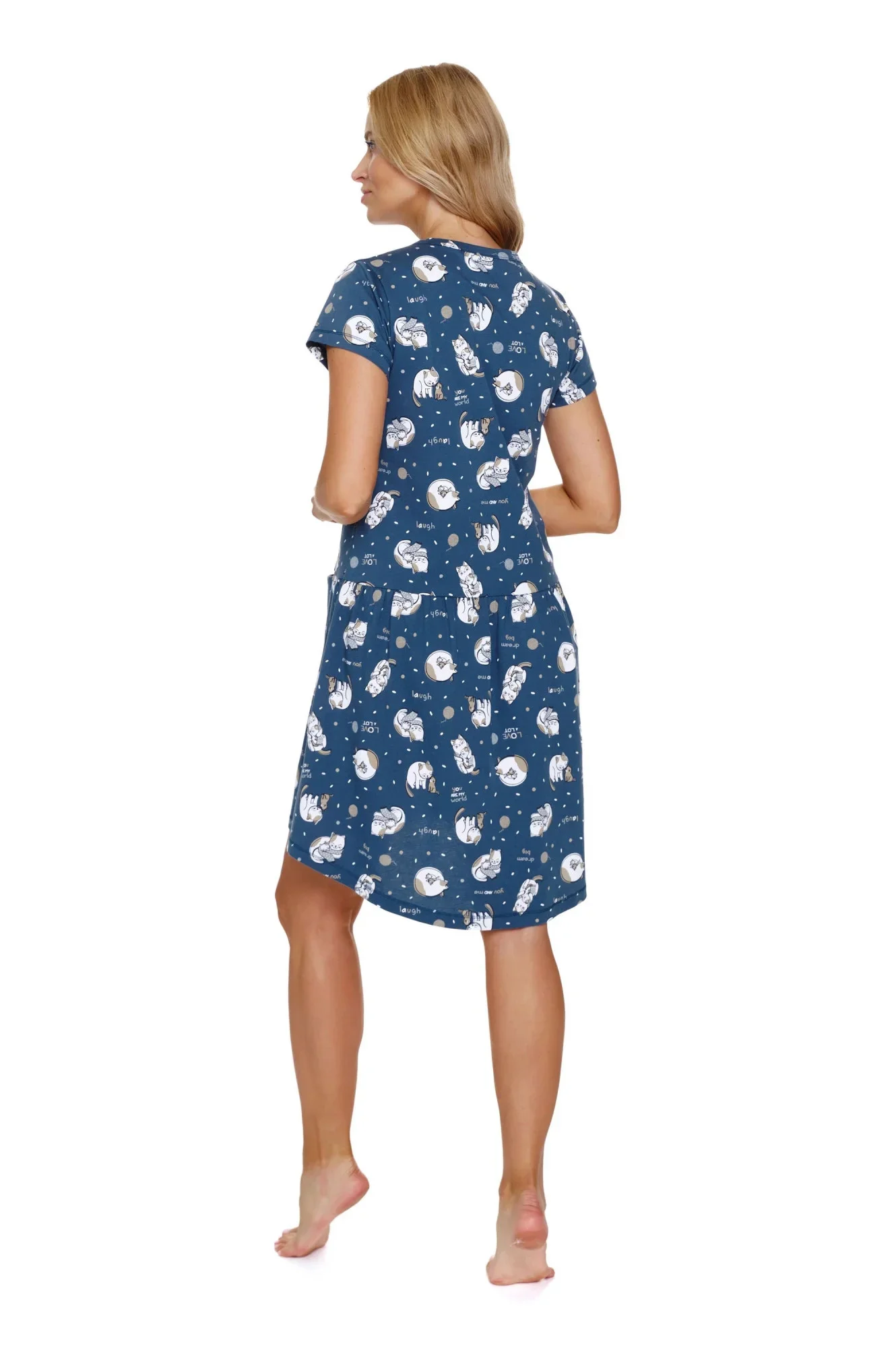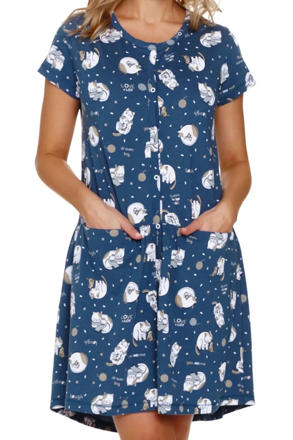 Dámská těhotenská košile 9444 Doctornap - světle modrá barva - z vysoce jakostní bavlny - s potiskem - zapínání na knoflíky po celé délce - krátké rukávy - praktické kapsy na bocích - spodní část zakončená volánem - ideální pro těhotné a kojící ženy - hypoalergenní, ekologická a bez škodlivých látek - certifikát OEKO-TEX Standard 100