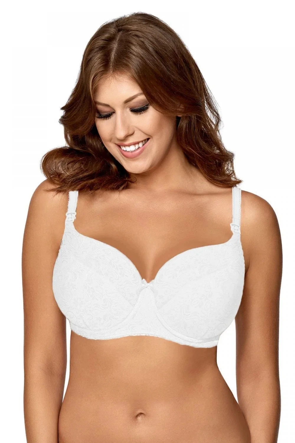 Dámská těhotenská podprsenka 925/4 white AVA - bílá barva - zdobená lesklým vzorem s květinovým motivem - část košíčků je lehce vyztužená s kosticemi - nastavitelná ramínka - zapínání typu clic-clac - odepínání a zapínání košíčků jednou rukou - mezi košíčky decentní mašličkaMateriálové složení: 88% polyamid + 8% bavlna + 4% elastan
