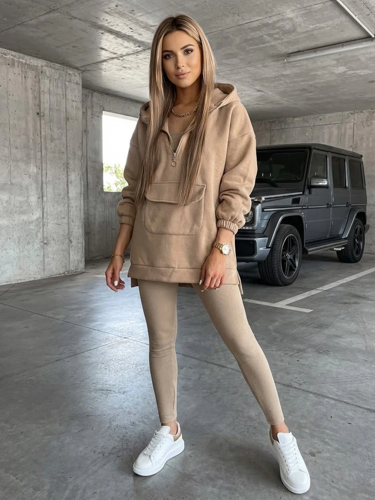 Tato dámská mikinová souprava s moderním ležérním charakterem kombinuje pohodlí s estetickým zpracováním. Souprava se skládá z mikiny s kapucí volnějšího střihu, topu a elastických legín s vysokým pasem. Základ z přírodní bavlny zajišťuje pohodlí a dobrou prodyšnost. Celá souprava bude vhodná pro každodenní nošení i městské stylizace.
